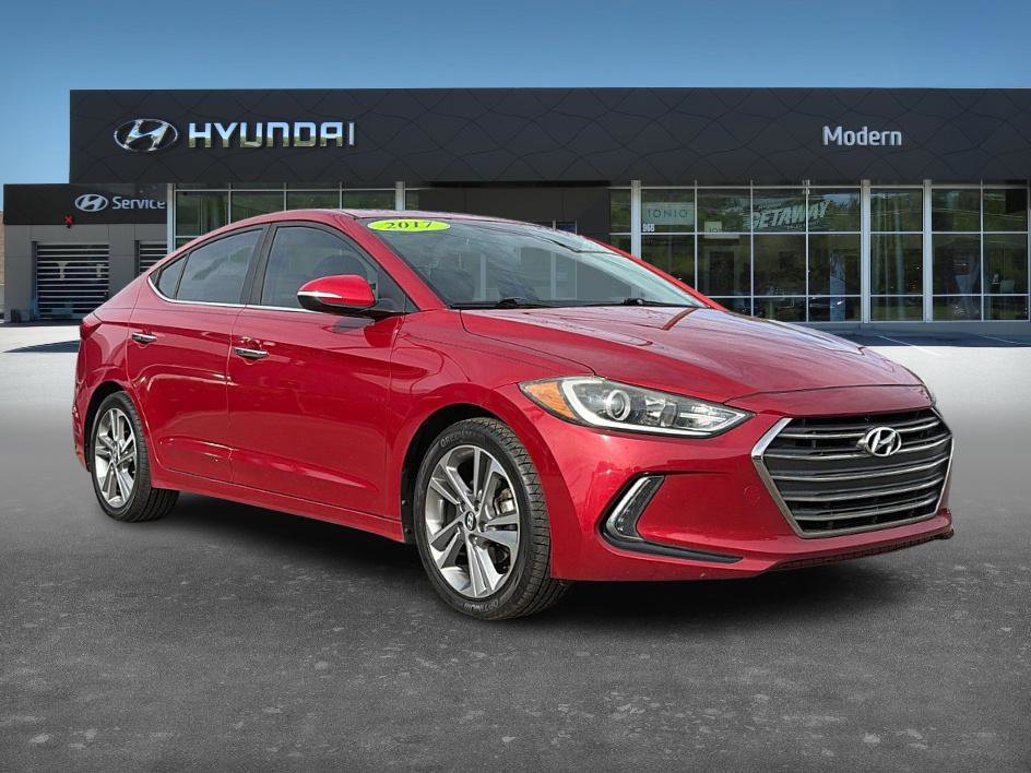 The 2017 Hyundai Elantra Limited offers a refined comfort and convenience package highlighted by a 7-inch touchscreen display audio system with six speakers, SiriusXM Radio with trial subscription, Apple CarPlay and Android Auto support, dual USB charging ports, Bluetooth hands-free connectivity, and Blue Link connected car services including remote start; it features dual automatic climate control with auto defogger, a power driver's seat with lumbar support, leather seating surfaces with heated front seats, a rear center armrest with integrated cup holders, a proximity key with push-button start and hands-free smart trunk, steering-wheel-mounted audio and cruise controls, plus added practicality with carpeted floor mats, a cargo net, a first aid kit, and an auto-dimming rearview mirror, all with no accidents reported. Scarlet Red Pearl FWD 6-Speed Automatic with Shiftronic 2.0L 4-Cylinder DOHC 16V. CARFAX One-Owner. Clean CARFAX.