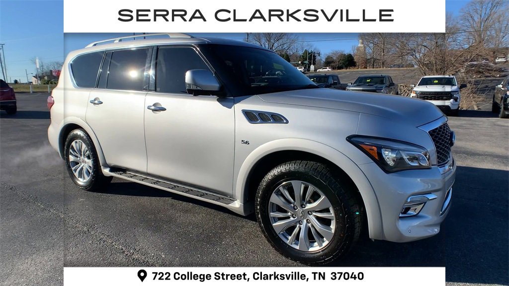 Liquid Platinum 2017 INFINITI QX80 The Pre-Owned 2017 INFINITI QX80 with 5.6L V8 at Serra Clarksville. Well equipped: 2.94 Axle Ratio, 3rd row seats: split-bench, 4-Wheel Disc Brakes, ABS brakes, Activation Disclaimer, Air Conditioning, Alloy wheels, AM/FM radio: SiriusXM, Anti-whiplash front head restraints, Auto High-beam Headlights, Auto tilt-away steering wheel, Auto-dimming door mirrors, Auto-dimming Rear-View mirror, Auto-leveling suspension, Automatic temperature control, Brake assist, Bumpers: body-color, CD player, Delay-off headlights, Driver door bin, Driver vanity mirror, Dual front impact airbags, Dual front side impact airbags, Electronic Stability Control, Emergency communication system: INFINITI Connection, Four wheel independent suspension, Front anti-roll bar, Front Bucket Seats, Front Center Armrest, Front dual zone A/C, Front fog lights, Front reading lights, Fully automatic headlights, Garage door transmitter: HomeLink, Genuine wood console insert, Genuine wood dashboard insert, Genuine wood door panel insert, Heated door mirrors, Heated front seats, Heated steering wheel, Illuminated entry, Leather Shift Knob, Leather steering wheel, Literature Kit, Low tire pressure warning, Memory seat, Navigation System, Occupant sensing airbag, Outside temperature display, Overhead airbag, Overhead console, Panic alarm, Passenger door bin, Passenger vanity mirror, Power door mirrors, Power driver seat, Power Liftgate, Power moonroof, Power passenger seat, Power steering, Power windows, Radio data system, Rain sensing wipers, Rear air conditioning, Rear anti-roll bar, Rear audio controls, Rear reading lights, Rear seat center armrest, Rear window defroster, Rear window wiper, Reclining 3rd row seat, Remote keyless entry, Roof rack: rails only, Security system, Speed control, Speed-sensing steering, Split folding rear seat, Spoiler, Steering wheel memory, Steering wheel mounted audio controls, Tachometer, Telescoping steering wheel, Tilt steering wheel, Traction control, Trip computer, Turn signal indicator mirrors, Variably intermittent wipers, and Voltmeter. Serra Cadillac Clarksville embodies a commitment to quality integrity and customer satisfaction with our Veteran Owned Value Driven culture. With a vast selection of top-tier pre-owned vehicles we cater to a diverse range of preferences lifestyles and budgets. When you are searching for a pre-owned SUV or used truck near Nashville look no further than Serra Cadillac Clarksville.