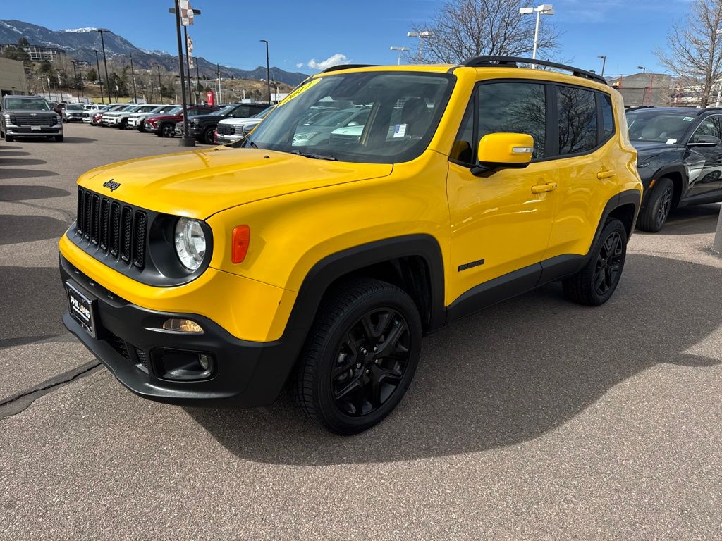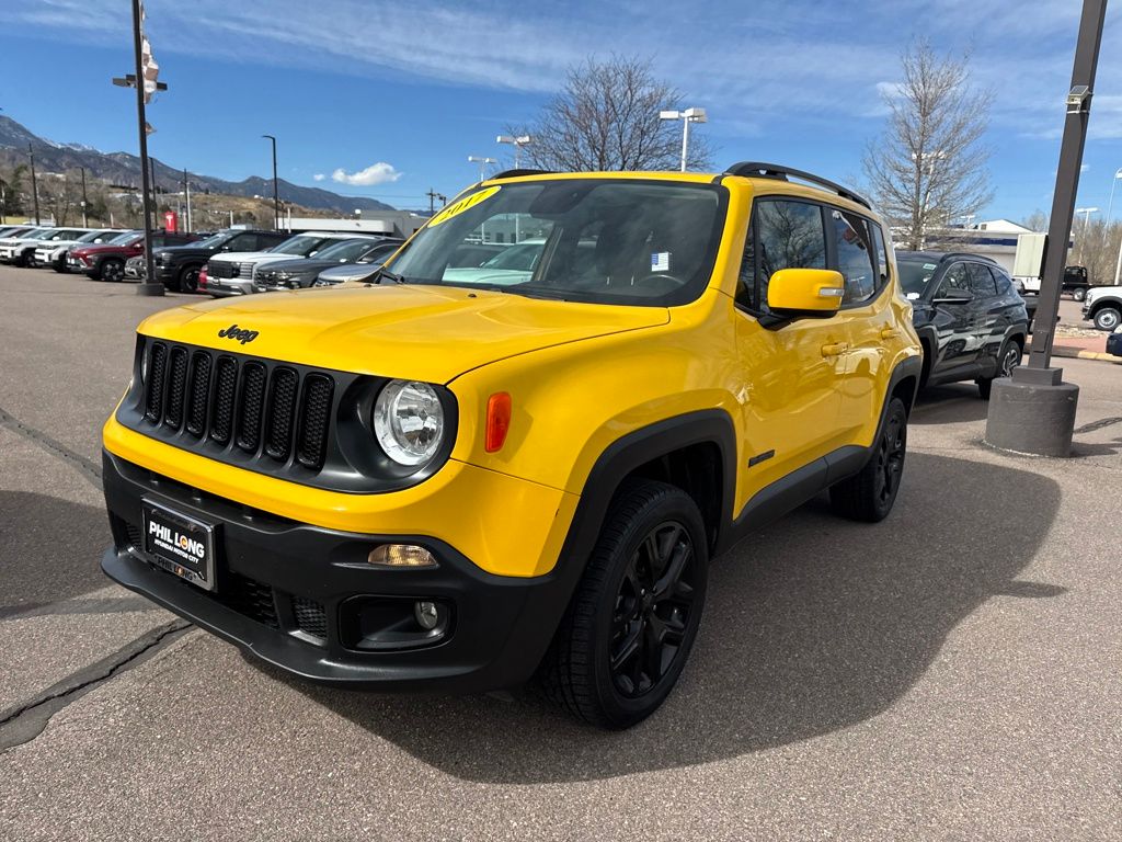 Recent Arrival! Always over 1,000 Pre-Owned in stock! No Payments for 90 days! Clean CARFAX. Odometer is 9427 miles below market average! Solar Yellow 2017 Jeep Renegade Altitude 4WD 9-Speed 948TE Automatic 2.4L I4 MultiAir 21/29 City/Highway MPG. Altitude Package, Cold Weather Group (All-Season Floor Mats, Heated Front Seats, Heated Steering Wheel, PTC Auxiliary Interior Heater, Rain Sensitive Windshield Wipers, and Windshield Wiper De-Icer), Passive Entry Remote Start Package (Passive Entry/Keyless Go), Quick Order Package 27L Altitude (Black Day Light Opening Moldings, Deluxe Cloth High-Back Bucket Seats, Exterior Mirrors w/Supplemental Signals, Gloss Black Badging, Gloss Black Fascia Applique, Gloss Black Instrument Panel Bezels, Vinyl Door Trim Panel, and Wheels: 18" x 8.0" Gloss Black), Trailer Tow Group (4 Pin Wiring Harness and Class III Receiver Hitch), 16" x 6.5" Aluminum Wheels, 4-Wheel Disc Brakes, 6 Speakers, ABS brakes, Air Conditioning, Alloy wheels, AM/FM radio: SiriusXM, Anti-whiplash front head restraints, Brake assist, Cloth Low-Back Bucket Seats, Compass, Delay-off headlights, Driver door bin, Driver vanity mirror, Dual front impact airbags, Dual front side impact airbags, Electronic Stability Control, Four wheel independent suspension, Front anti-roll bar, Front Bucket Seats, Front Center Armrest, Front fog lights, Front reading lights, Fully automatic headlights, Goodyear Brand Tires (DISC), Heated door mirrors, Illuminated entry, Knee airbag, Leather steering wheel, Low tire pressure warning, Manufacturer's Statement of Origin, Normal Duty Suspension, Occupant sensing airbag, Outside temperature display, Overhead airbag, Overhead console, Panic alarm, ParkView Rear Back-Up Camera, Passenger door bin, Passenger vanity mirror, Power door mirrors, Power steering, Power windows, Radio data system, Radio: Uconnect 3 w/5" description (The full description of the vehicle).