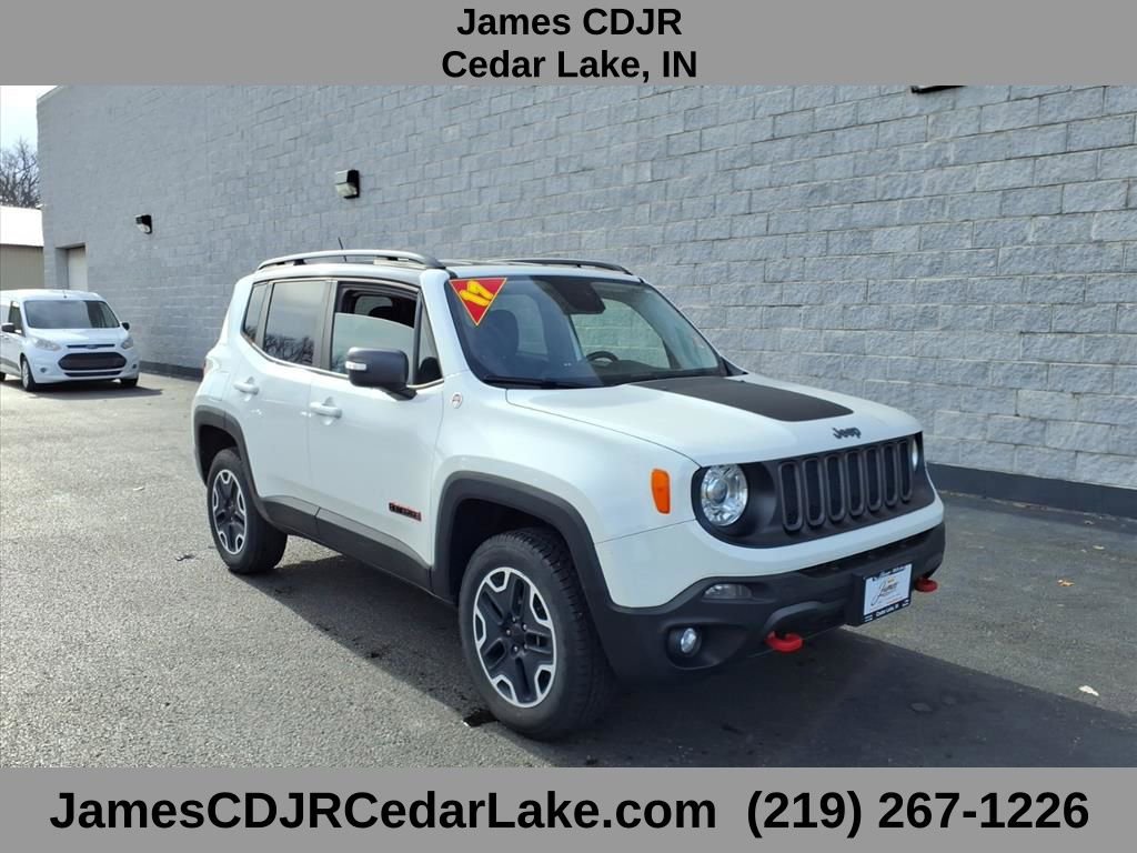 Recent Arrival! 2017 Jeep Renegade Trailhawk Clean Carfax, GPS Navigation, Remote Start, Touch Screen Display, Push Button Start, Keyless Entry, Heated Front Seats, Heated Steering Wheel, 4 Wheel Drive / 4x4 / 4WD, Tinted Windows, Tow Hitch, Tow Hooks, Rain Sensing Wipers, Bluetooth, USB Ports, Auxiliary Ports, HD Radio, Blind Spot Warning, ParkView Rear Back Up Camera, Blind Spot and Cross Path Detection, Aluminum Wheels, Steering Wheel with Audio Controls, Integrated Voice Command with Bluetooth, Deep Tint Sunscreen (Privacy) Glass, Rear Back Up Camera, Low Miles! Renegade Trailhawk, 4D Sport Utility, 2.4L I4 MultiAir, 9-Speed 948TE Automatic, 4WD, Alpine White, Black Cloth, 17" x 6.5" Aluminum Wheels, 6 Speakers, 6.5" Navigation Group w/Uconnect, 6.5" Touchscreen Display, Blind Spot & Cross Path Detection, Cold Weather Group II, Delay-off headlights, Four wheel independent suspension, Front fog lights, Fully automatic headlights, GPS Navigation, HD Radio, Heated Front Seats, Heated Steering Wheel, High-Intensity Discharge Headlamps, Normal Duty Suspension, Outside temperature display, Overhead console, Passenger vanity mirror, Passive Entry Remote Start Package, Passive Entry/Keyless Go, Power steering, Power windows, Quick Order Package 27E, Radio: Uconnect 6.5 Nav, Rain sensing wipers, Rear window wiper, Remote keyless entry, Remote USB Port, Safety & Security Group, Security Alarm, SiriusXM Traffic, SiriusXM Travel Link, Tonneau Cover, Traction control, Uconnect Access. Clean Carfax. Alpine White. Odometer is 47324 miles below market average! Here at James CDJR we price our Pre-Owned Vehicles with Market Based Pricing. This means you are getting our best price upfront. This allows you to spend more time enjoying your new car and less time at the dealership. Our promise to our customers is to have the quickest and easiest car buying experience in our industry.