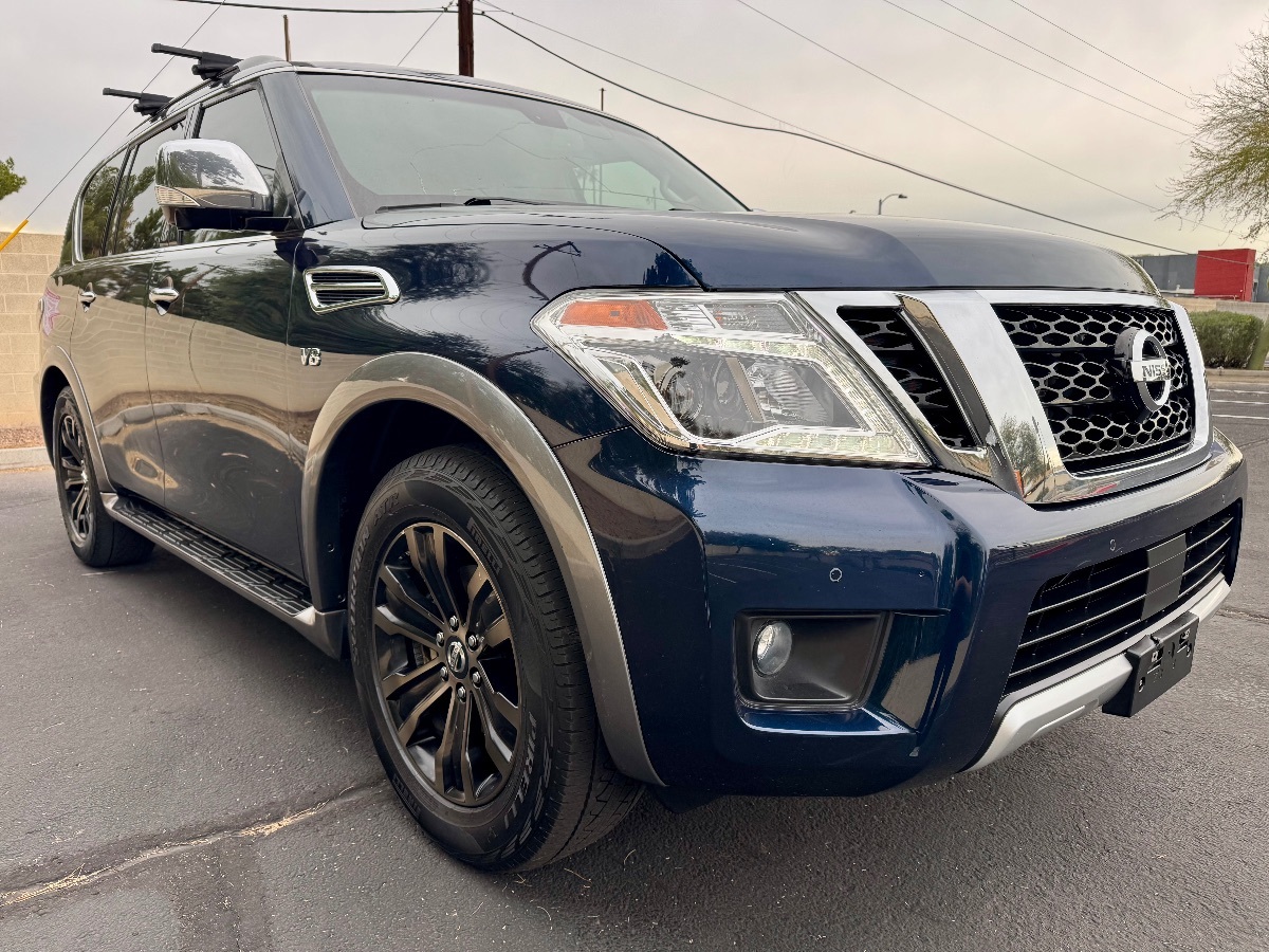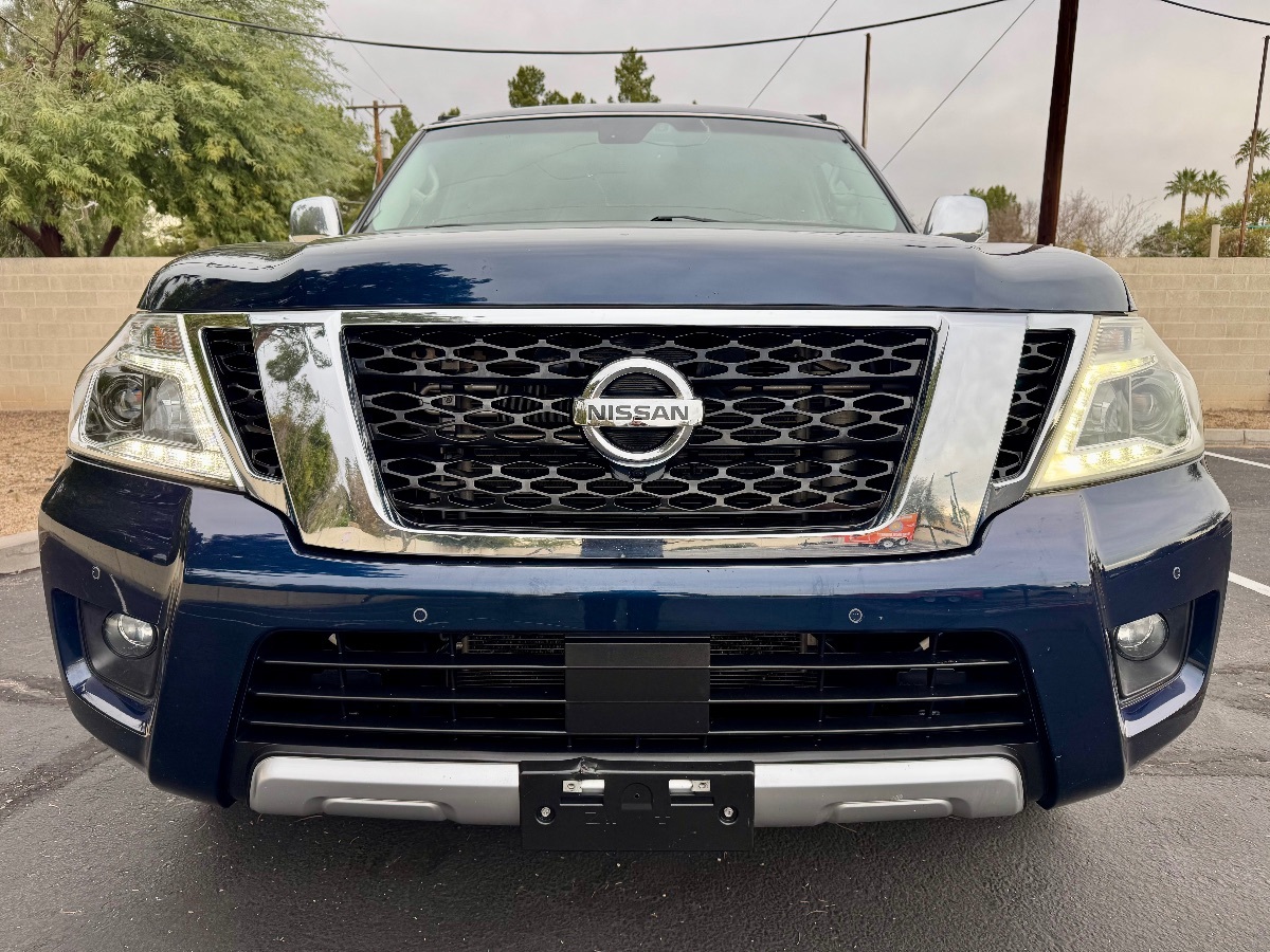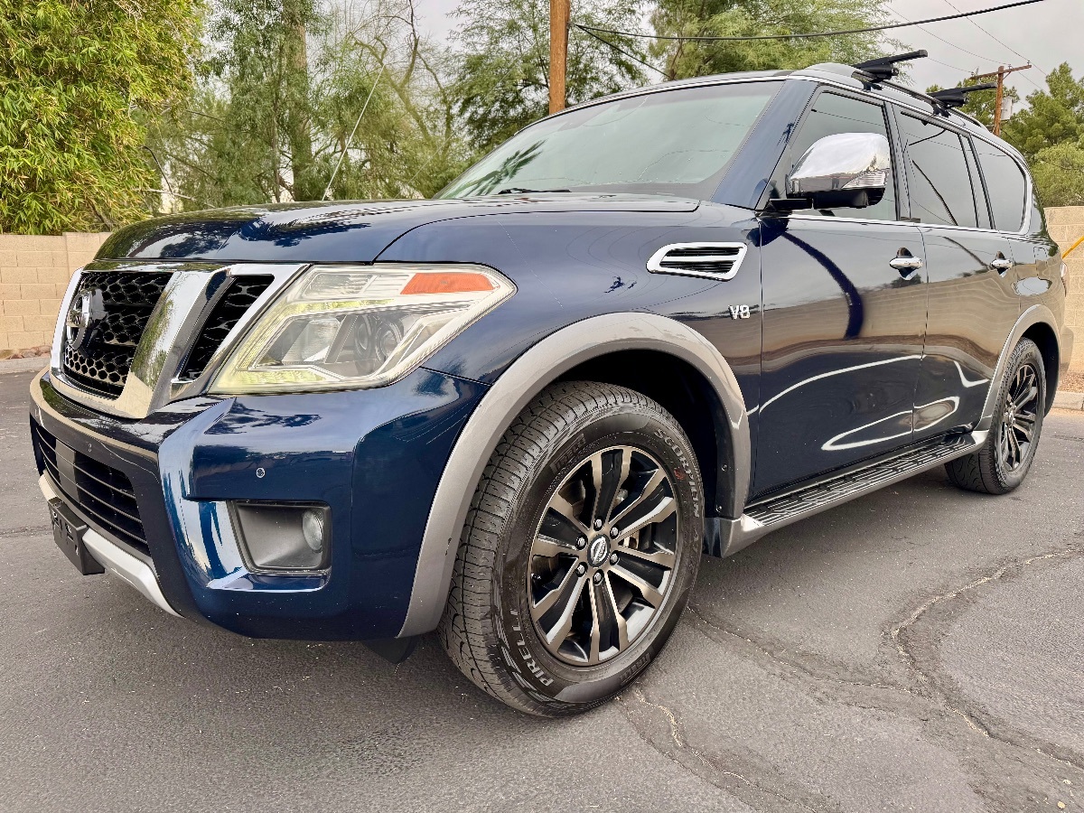 Introducing an exceptional opportunity to own a Carfax 1-Owner 2017 Nissan Armada 4x4 Platinum, a perfect blend of sophistication and rugged capability. Dressed in a striking Hermosa Blue exterior, this full-size SUV makes a statement wherever it goes, complemented by refined charcoal leather-appointed seat trim inside. Beneath its bold exterior, the Armada is powered by a robust 5.6L V8 engine, ensuring you have all the power needed for dynamic driving experiences. The 4x4 Platinum style, paired with a Four Wheel Drive drivetrain, makes this Armada adept at handling both urban roads and off-road terrains with equal prowess. Comfort is ensured for passengers in every seat with the inclusion of [L92] 2nd & 3rd row carpeted mats, providing a plush atmosphere throughout the spacious cabin. This vehicle was built to meet the [C03] 50 state emissions standard, ensuring it is environmentally conscious without compromising performance. Additional touches such as the [Z66] activation disclaimer and [Z67] TPMS activation highlight the attention to detail and refined technology included in this top-tier model. Safety and convenience are paramount in the design of this Nissan Armada, allowing for each drive to be as enjoyable as the last. Whether you're navigating everyday routes or setting off on grand adventures, this Armada stands ready to reliably and stylishly get you to your destination. Don't miss your chance to own this remarkable SUV with a pristine Carfax history.
