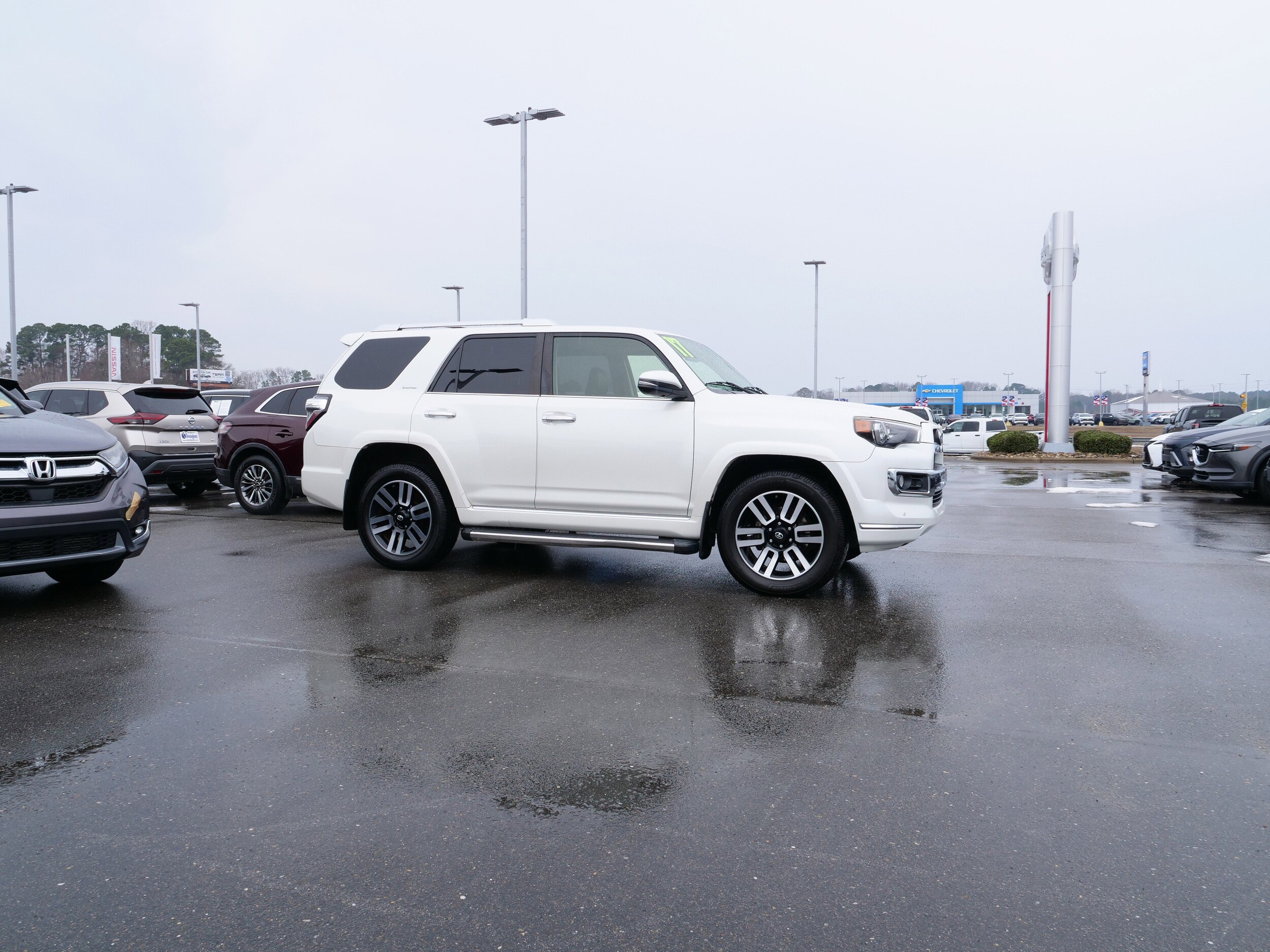 White 2017 Toyota 4Runner 4.0L V6 SMPI DOHC 5-Speed Automatic with Overdrive 4WD, 3.727 Axle Ratio, 4-Wheel Disc Brakes, ABS brakes, Air Conditioning, Alloy wheels, AM/FM radio: SiriusXM, Anti-whiplash front head restraints, Brake assist, Bumpers: body-color, CD player, Driver door bin, Driver vanity mirror, Dual front impact airbags, Dual front side impact airbags, Electronic Stability Control, Emergency communication system: Safety Connect, Exterior Parking Camera Rear, Front anti-roll bar, Front Bucket Seats, Front Center Armrest, Front fog lights, Front reading lights, Front wheel independent suspension, Heated door mirrors, Illuminated entry, Knee airbag, Leather Shift Knob, Low tire pressure warning, Occupant sensing airbag, Outside temperature display, Overhead airbag, Overhead console, Panic alarm, Passenger door bin, Passenger vanity mirror, Power door mirrors, Power driver seat, Power steering, Power windows, Rear anti-roll bar, Rear seat center armrest, Rear window defroster, Rear window wiper, Remote keyless entry, Roof rack: rails only, Security system, Speed control, Speed-sensing steering, Split folding rear seat, Spoiler, Steering wheel mounted audio controls, Tachometer, Telescoping steering wheel, Tilt steering wheel, Traction control, Trip computer, and Variably intermittent wipers.