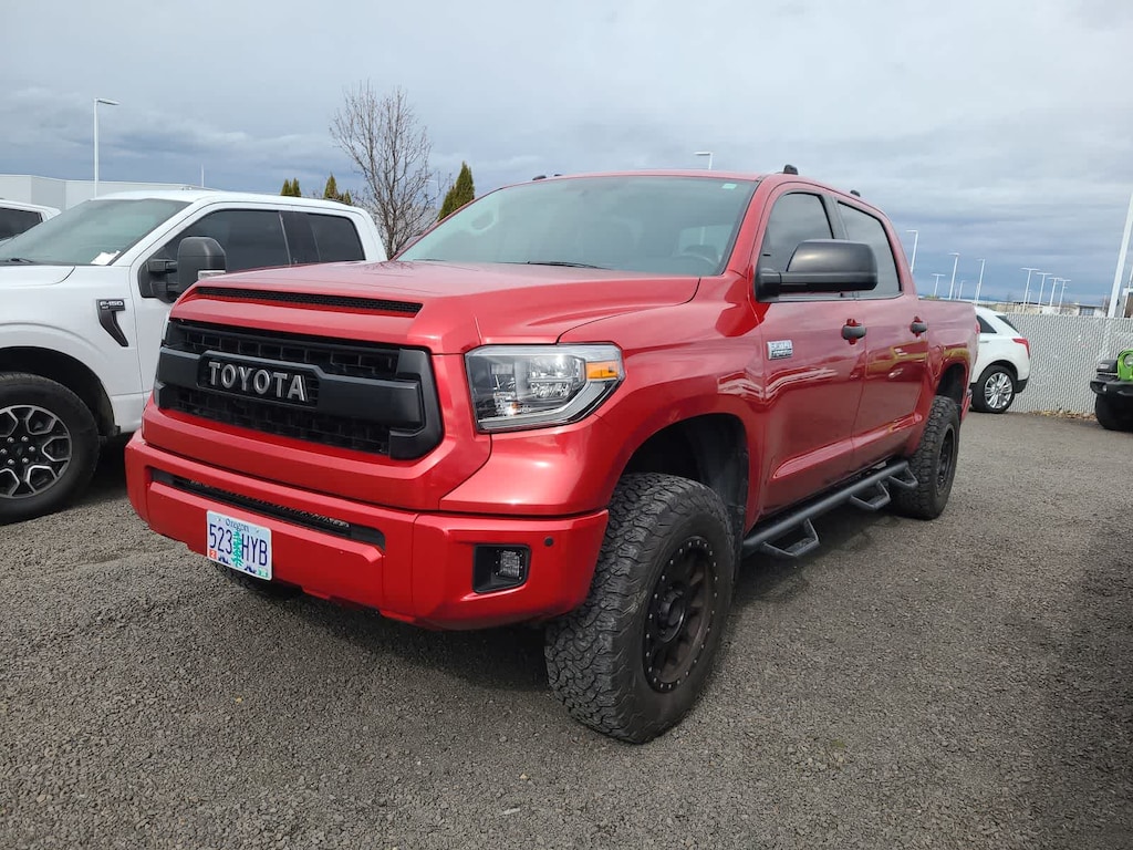 LOW MILES - 67,602! Platinum trim, Barcelona Red Metallic exterior and BLACK interior. Heated Leather Seats, Nav System, Moonroof, Hitch, Aluminum Wheels, 4x4. Lithia Chrysler Jeep Dodge has been a supporting member of the Southern Oregon community since 1946. We are conveniently located just past Costco on Hwy 62. Drop in and see us today and see the benefits that the Superstore has to offer. Toyota Platinum with Barcelona Red Metallic exterior and BLACK interior features a 8 Cylinder Engine with 381 HP at 5600 RPM. The 2017 Toyota Tundra features an attractive cabin filled with user-friendly technology. Seating comfort up front is as good as youd expect.