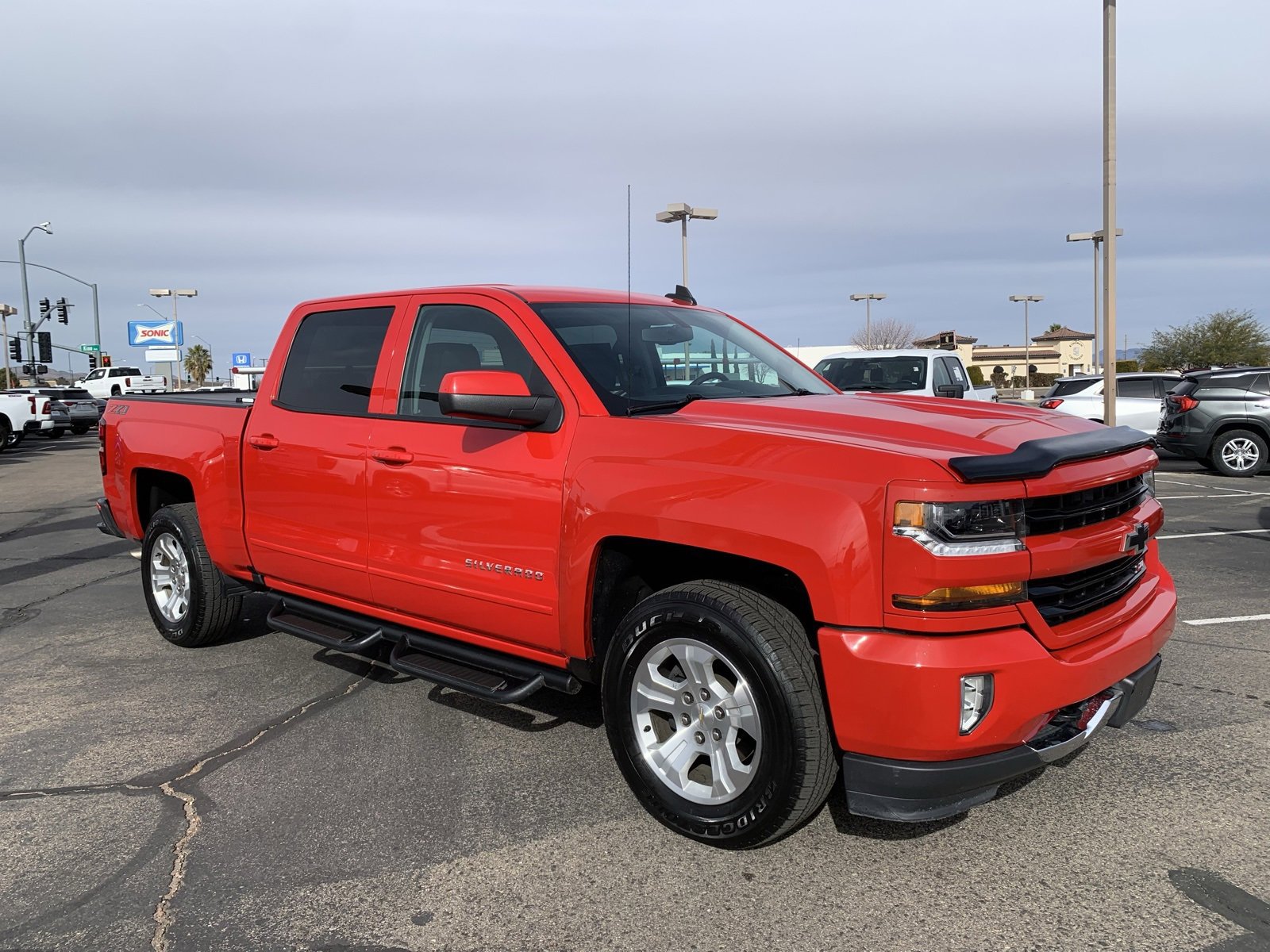 This 2018 Silverado 1500 LT delivers proven V8 power and everyday comfort, powered by a 5.3L EcoTec3 V8 engine paired with a 6-speed automatic transmission and 2-speed transfer case. Equipped with the All Star Edition and Z71 Off-Road Package, it features an auto-locking rear differential, off-road suspension, hill descent control, front recovery hooks, and skid plate protection for confident capability on or off the pavement. Inside, enjoy heated front seats, leather-appointed seating surfaces, a power driver seat, dual-zone automatic climate control, remote start, and a leather-wrapped steering wheel with audio controls. Technology highlights include an 8-inch touchscreen with navigation and Chevrolet MyLink, rear vision camera, color driver information display, SiriusXM, and 4G LTE Wi-Fi capability. Built for work and play, it’s also equipped with the trailering package, integrated trailer brake controller, EZ-Lift tailgate, cargo box LED lighting, and 110-volt power outlet. Finished in Red Hot with 18 bright-machined aluminum wheels, black bowtie emblems, and off-road assist steps, this Silverado blends capability, comfort, and bold styling.
