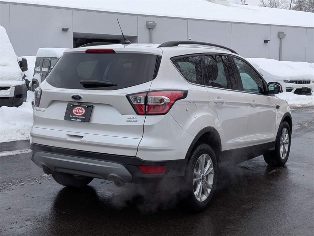 2018 Ford Escape SEL 4WD finished in White Platinum Metallic Tri-Coat over Charcoal Black Leather-Trimmed Interior powered by the 1.5L EcoBoost Engine paired to a 6-Speed Automatic Transmission with SelectShift and intelligent 4WD capability. CARFAX reports no accidents or damage, no structural damage, no airbag deployment, no total loss, clean title history, no odometer issues, and no open recalls reported. Two previous owners in New York with a strong documented service history showing regular oil changes and consistent maintenance, most recently serviced July 2025 with oil and filter change. Previously a personal lease vehicle and then privately owned, both owners drove well below the national average miles per year. CARFAX reliability forecast shows average repair risk with average repair costs estimated at approximately $450 per year, and this vehicle qualifies as Well Maintained with Regular Oil Changes reported. Current mileage is 64,788. Well equipped with Equipment Group 300A and upgraded White Platinum Tri-Coat paint, this Escape features 17-Inch Sparkle Silver Painted Aluminum Wheels, LED Signature Lighting, LED Taillamps, Fog Lamps, Chrome Dual Exhaust Tips, Heated Power Mirrors, Privacy Glass, Roof Rack Side Rails, and Power Liftgate. Interior highlights include Leather-Trimmed Heated Front Seats with 10-Way Power Driver Seat, Dual-Zone Automatic Climate Control, SYNC 3 with 8-Inch Touchscreen, Apple CarPlay and Android Auto capability, SiriusXM, Reverse Sensing System, Rear View Camera, Remote Keyless Entry, SecuriCode Keyless Entry Keypad, Leather-Wrapped Steering Wheel, Smart Charging USB Ports, and 60/40 Split Folding Rear Seats for flexible cargo space. Safety features include AdvanceTrac with Roll Stability Control, SOS Post-Crash Alert System, Driver Knee Airbag, Front and Side Curtain Airbags, Tire Pressure Monitoring System, Curve Control, and 4-Wheel Disc Brakes with ABS. A well-maintained, accident-free, two-owner 4WD SUV offering turbocharged efficiency, strong service history, modern technology, and everyday practicality.