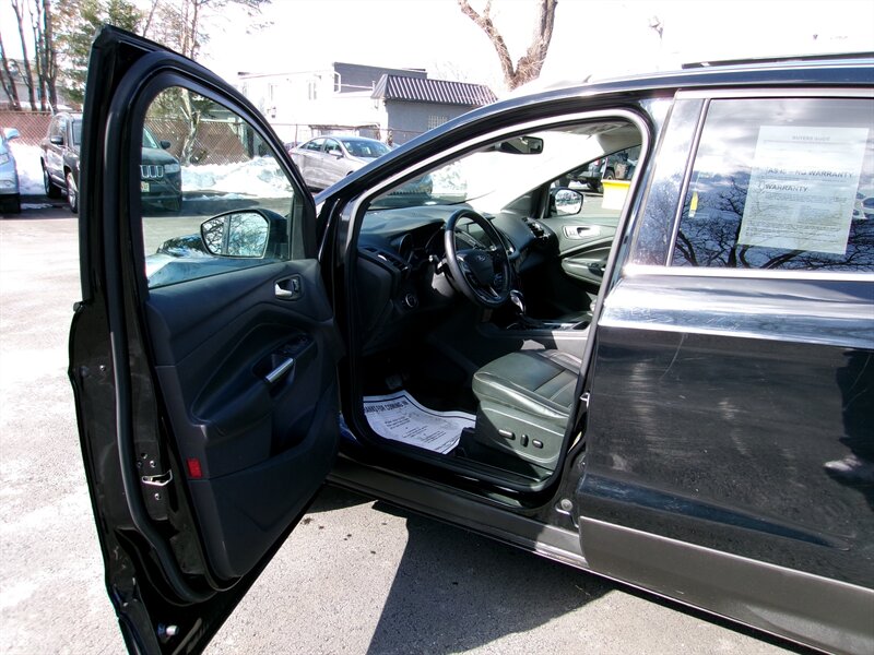2018 Ford Escape Titanium — Description and Factory Features Powertrain and performance — EcoBoost 2.0L Turbo I4: factory-rated at 245 horsepower and 275 lb-ft of torque. The turbocharged, direct-injection four-cylinder provides the balance of everyday drivability and freeway passing power expected from the EcoBoost family. Automatic transmission with electronic shift control and SelectShift manual shift mode. Front-wheel drive is standard; all-wheel drive was available from the factory for better traction in varied conditions. Distinctive Titanium trim appointments including a chrome-accented grille and bright exterior trim details. Alloy wheels (larger, machined/finished design typical of the Titanium level) and all-season tires. Projector-style headlights with integrated daytime running lights and fog lamps for improved low-light visibility. Heated power side mirrors with integrated turn-signal indicators. Roof rails for cargo flexibility and a power glass moonroof/sunroof available on many factory-equipped Titanium models. Dual chrome exhaust outlets for a finished look at the rear. Leather-trimmed seating surfaces throughout the cabin. Heated front seats as standard; power-adjustable driver’s seat with lumbar support for improved comfort on longer drives. Leather-wrapped multifunction steering wheel with audio and cruise controls. Dual-zone automatic climate control to maintain separate temperature settings for driver and front passenger. 60/40-split rear seats that fold to expand cargo area; durable cargo floor and covered storage spaces. SYNC 3 infotainment system with an 8-inch touchscreen (factory-equipped on Titanium), offering responsive menus and easy-to-use controls. Apple CarPlay and Android Auto compatibility, Bluetooth hands-free calling and audio streaming, and voice-activated controls. USB ports and auxiliary input jacks for device connectivity and charging. Available premium Sony audio system on Titanium for upgraded sound quality. Keyless entry with push-button start for rapid access and engine start. Remote start capability available from the factory on many Titanium-equipped vehicles. Power liftgate / hands-free liftgate functionality was available on many factory Titanium builds to ease loading and unloading. Standard passive safety systems: multiple airbags (front, side curtain), anti-lock brakes, electronic stability control and traction control. Rearview camera to aid in backing and parking maneuvers. Blind Spot Information System (BLIS) with cross-traffic alert and available rear parking sensors were commonly included on the Titanium trim or packaged from the factory as part of advanced safety options. Additional advanced driver-assist features such as adaptive cruise control, lane keeping system, and pre-collision mitigation were available as factory options or bundled packages depending on the original build specification. A balance of passenger comfort and cargo flexibility suitable for daily commuting and weekend errands. Efficient turbocharged engine offering competitive fuel economy for the segment while retaining usable midrange torque.