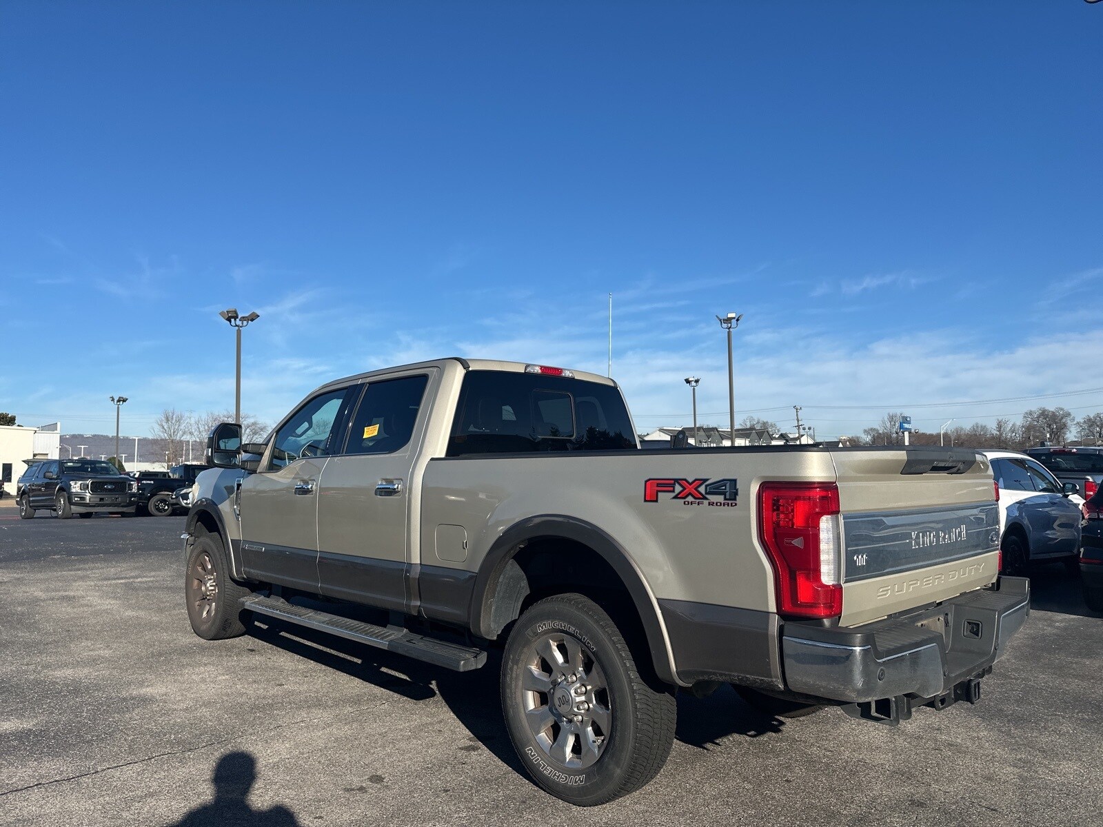 2018 Ford F-250SD King Ranch F-250 SuperDuty King Ranch, 4D Crew Cab, Power Stroke 6.7L V8 DI 32V OHV Turbodiesel, TorqShift 6-Speed Automatic, 4WD, Gold, 6 Angular Chrome Step Bars, Body-Color Door Handles w/Chrome Insert, Chrome Exhaust Tip, Chrome Front & Rear Bumpers, Chrome Package, FX4 Off-Road Package, GVWR: 10,000 lb Payload Package, Hill Descent Control, Navigation System, Off-Road Specifically Tuned Shock Absorbers, Order Code 700A, Unique Chrome Mirror Caps, Unique FX4 Off-Road Box Decal, Wheels: 18 Chrome PVD Aluminum, 10 Speakers, 110V/400W Outlet, 4-Wheel Disc Brakes, 6 Angular Chrome Extended Running Boards, ABS brakes, Adaptive Cruise Control & Collision Warning, Adaptive Steering, Adjustable pedals, Air Conditioning, Alloy wheels, AM/FM radio: SiriusXM, AppLink/Apple CarPlay and Android Auto, Auto High-beam Headlights, Auto tilt-away steering wheel, Auto-dimming Rear-View mirror, Automatic temperature control, BLIS Blind Spot Information System, Brake assist, CD player, Compass, Cruise Control, Delay-off headlights, Driver door bin, Driver vanity mirror, Dual Extra Heavy-Duty Alternators (Total 377-Amps), Dual front impact airbags, Dual front side impact airbags, Electronic Stability Control, Emergency communication system: SYNC 3 911 Assist, Engine Block Heater, Flow-Through Console, Front anti-roll bar, Front Bucket Seats, Front Center Armrest, Front dual zone A/C, Front fog lights, Front reading lights, Fully automatic headlights, Garage door transmitter, Heated and Cooled Seats, Heated door mirrors, Heated steering wheel, Illuminated entry, Illuminated running boards, Leather steering wheel, Low tire pressure warning, Memory seat, Outside temperature display, Overhead airbag, Overhead console, Panic alarm, Passenger door bin, Passenger vanity mirror, Pedal memory, Power door mirrors, Power driver seat, Power passenger seat, Power steering, Power windows.