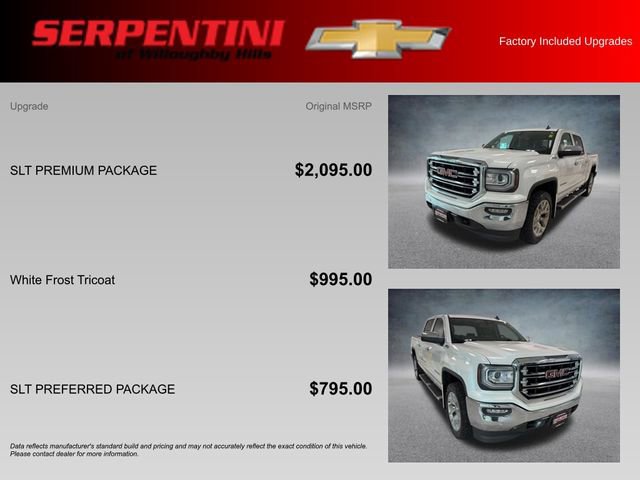 Heated front seats, bed liner, trailering package, leather interior, Bose sound system, 10 way power driver seat, remote start. Recent arrival! 2018 White Frost Tricoat GMC Sierra 1500 SLT EcoTec3 5.3L V8 6-Speed Automatic Electronic with Overdrive. This GMC Sierra 1500 has many features and is well equipped including. Priced below KBB Fair Purchase Price! CARFAX One-Owner. Odometer is 26449 miles below market average! New and preowned vehicles *Please reach out to our sales team on IN TRANSIT vehicle pricing. The prices listed on these units are MSRP provided by the manufacturer and may not be the final sale price of the vehicle. Tax, title, license and dealer fees are extra. With approved credit. Not available with special finance or lease offers. New vehicle market adjustments are based on the current supply and demand of the vehicles. This takes into account all current market conditions including the shortages that exist on certain New Chevrolet vehicles. Please contact the dealer for details. Dealer not responsible for pricing errors and equipment discrepancy. Some pictures are for illustration purposes only.