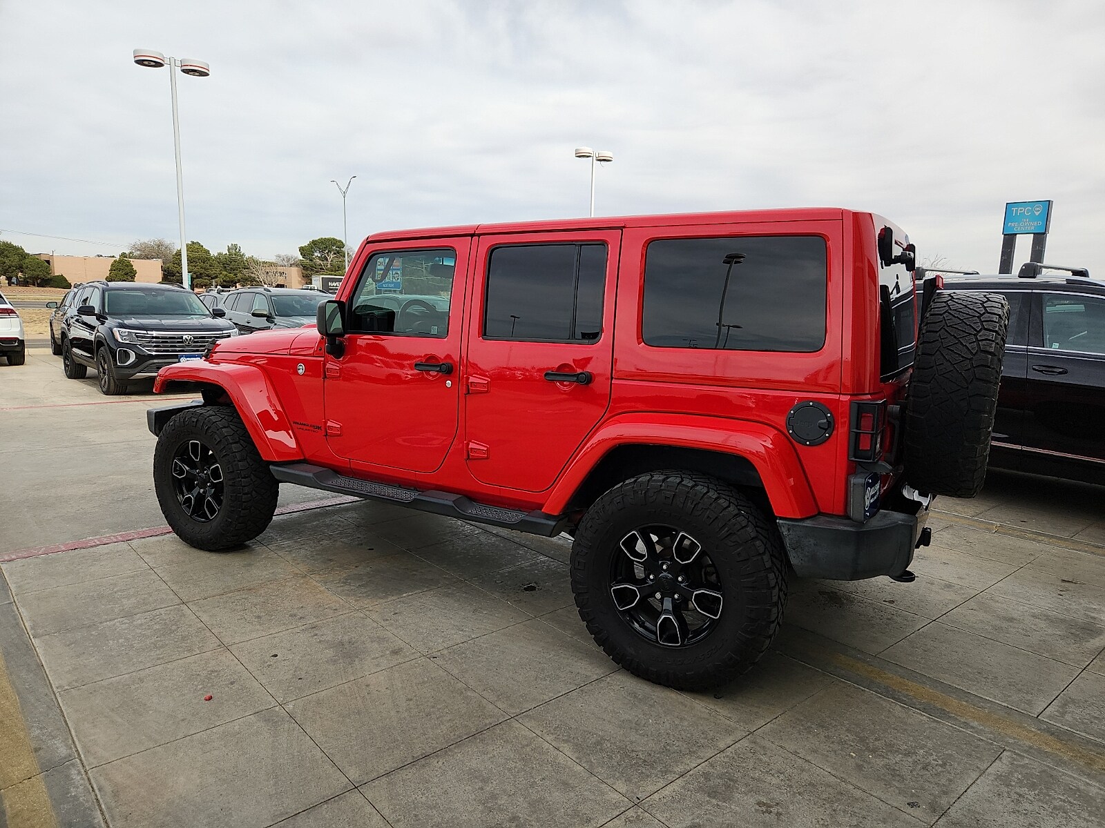 This used 2018 Jeep Wrangler JK Unlimited Sahara 4x4 SUV is located at Volkswagen of Midland-Odessa. It features a V-6 engine, automatic transmission, and a Firecracker Red exterior with a black interior. The vehicle offers a comfortable ride for up to five passengers and is equipped with convenience features and off-road capabilities. Experience this vehicle via video call and ask us any questions you have.