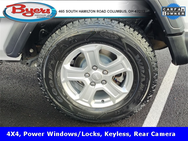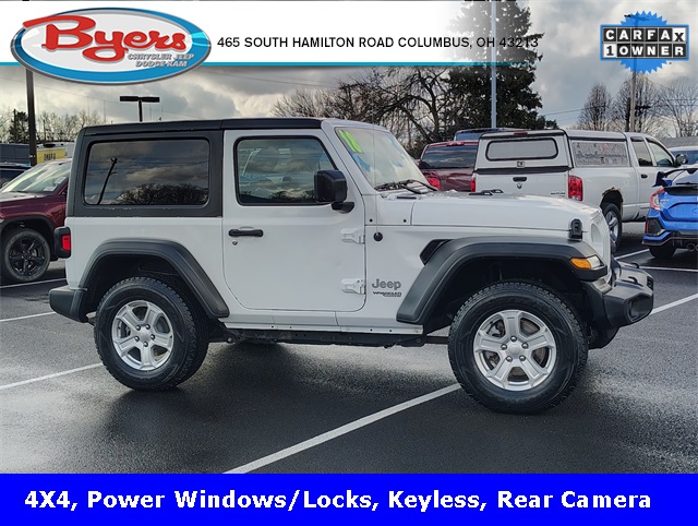 2018 Bright White Clearcoat Jeep Wrangler Sport S 2.0L I4 DOHC 4WD 8-Speed Automatic This Jeep Wrangler has many features and is well equipped including, 4-Wheel Disc Brakes, 8 Speakers, ABS brakes, Air Conditioning, AM/FM radio, Automatic Headlamps, Black 3-Piece Hard Top, Brake assist, Deep Tint Sunscreen Windows, Electronic Stability Control, Freedom Panel Storage Bag, Front 1-Touch Down Power Windows, Front Bucket Seats, Front Center Armrest w/Storage, Front fog lights, Leather Wrapped Steering Wheel, ParkView Rear Back-Up Camera, Power Heated Mirrors, Quick Order Package 28S Sport S, Radio: Uconnect 3 w/5" Display, Rear Window Defroster, Rear Window Wiper/Washer, Remote Keyless Entry, Security Alarm, Speed control, Speed Sensitive Power Locks, Steering wheel mounted audio controls, Sun Visors w/Illuminated Vanity Mirrors, Telescoping steering wheel, Tilt steering wheel, Traction control, Variably intermittent wipers, Wheels: 17" x 7.5" Tech Silver Aluminum. CARFAX One-Owner. Clean CARFAX.