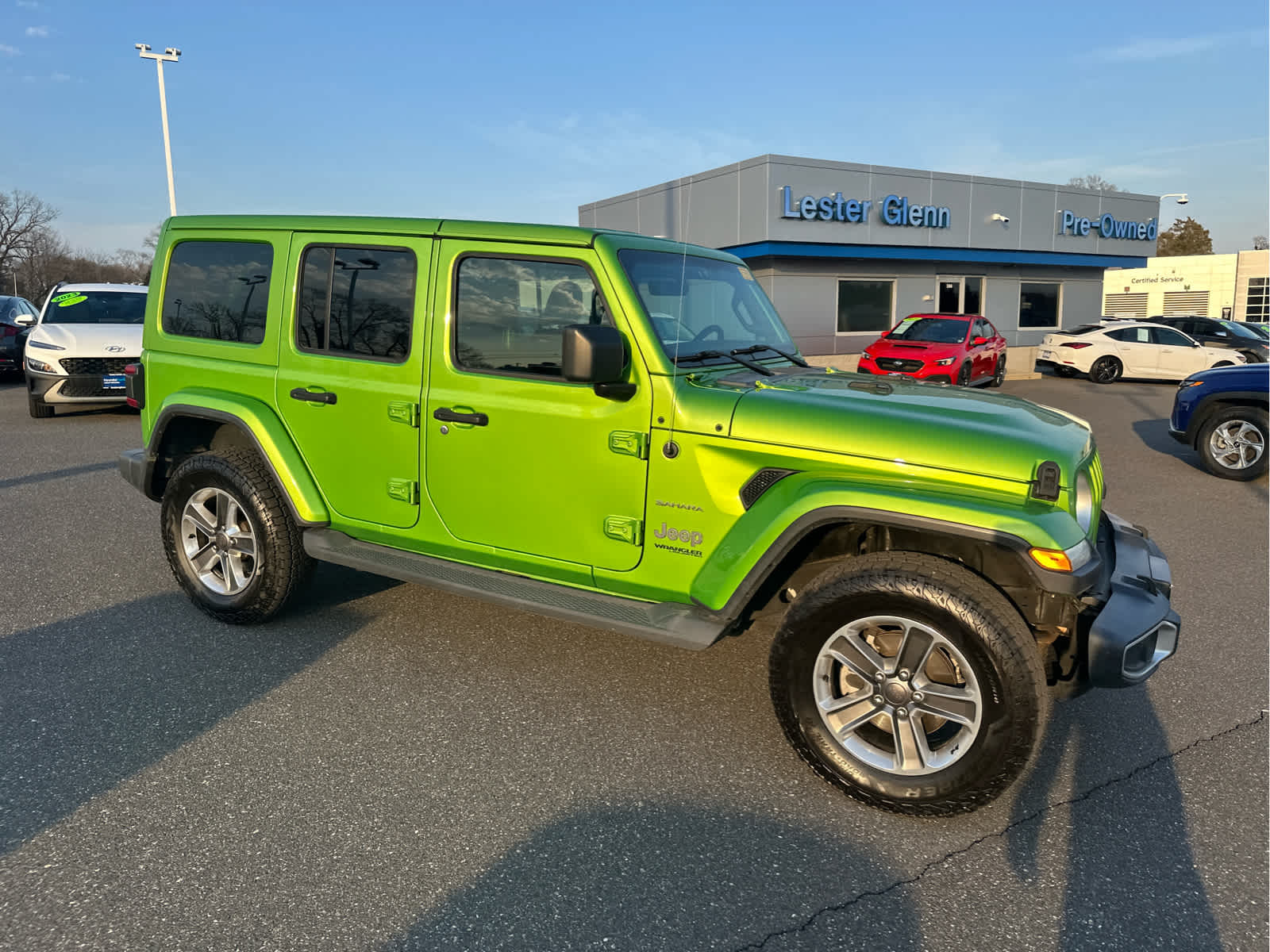Online vehicle price does not include the $749 dealer documentation fee, the $1,824 vehicle appearance package for eligible new vehicles, or the $895 certification fee on eligible, certified vehicles. EPA 24 MPG Hwy/22 MPG City! Sahara trim. CARFAX 1-Owner. Heated Seats, 4x4, CD Player, iPod/MP3 Input, Running Boards, Back-Up Camera, Turbo Charged, Remote Start System, Black 3-Piece Hard Top, Engine: 2.0L I4 DOHC DI Turbo Etorque. KEY FEATURES INCLUDE 4x4, Back-Up Camera, Running Boards, iPod/MP3 Input, CD Player Jeep Sahara with Mojito! Clearcoat exterior and Black interior features a 4 Cylinder Engine with 270 HP at 5250 RPM. Now made of aluminum, the doors are much easier to lift off, especially if you roll down the window so you can reach through and pull the door free with the new handhold under the armrest. This Wrangler Unlimited is priced $2,900 below J.D. Power Retail. Service Work completed on this Jeep Wrangler Unlimited included: Complete Multi-Point Inspection, Tires Inspected, Brake Inspection, Brake System Flush, Emissions System Check, Professional Detailed Inside and Out, Function Test all Lights, Check the Complete Exhaust System, Cooling System Inspection, Transmission Fluid Inspection, Differential Fluid Inspection, Function Test all Options & Accessories. Lester Glenn Hyundai offers complimentary loaner vehicles and shuttle service while your vehicle is in for service with every pre-owned vehicle purchase!