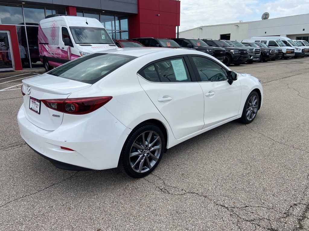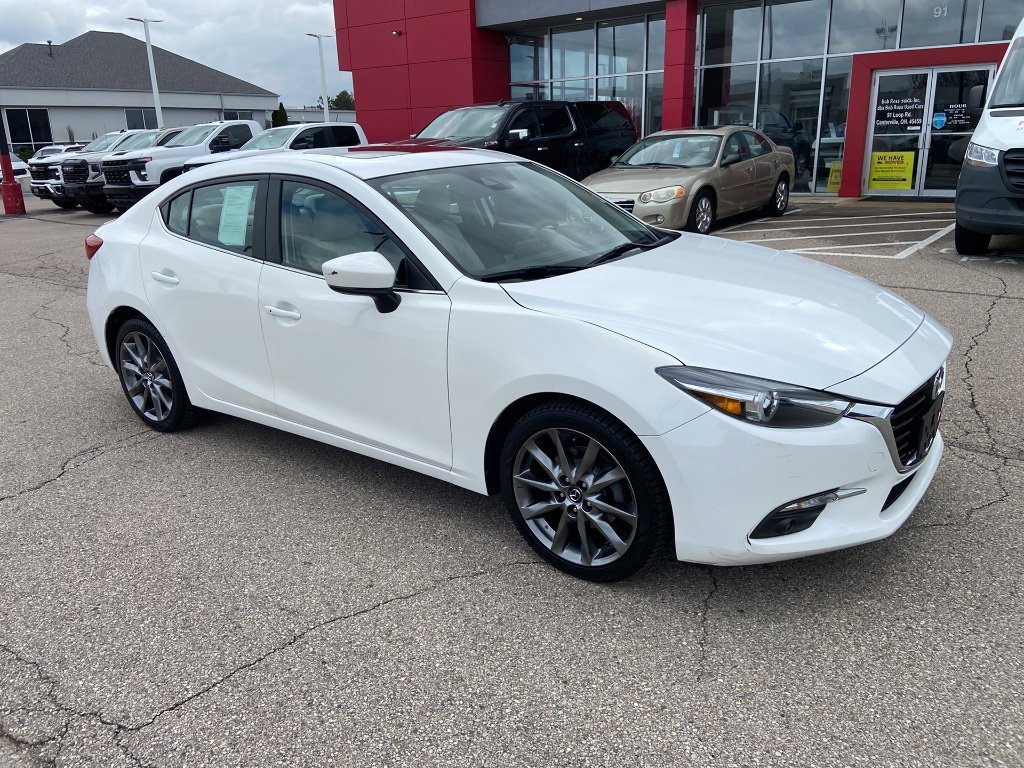 Experience premium features and sporty performance in this 2018 Mazda Mazda3 Grand Touring Sedan. Dressed in classic white, this sedan is powered by a responsive SKYACTIV-G 2.5L I4 engine paired with a smooth 6-speed shiftable automatic transmission for an engaging drive. Enjoy luxury touches like leather-trimmed upholstery, heated front seats, and a power moonroof. Stay safe with advanced features including Front Automatic Emergency Braking, Blind Spot Monitoring, Rear Cross Traffic Alert, and a rearview camera. Technology highlights include a 7-inch touchscreen with MAZDA CONNECT infotainment, Bose premium sound, SiriusXM radio, Bluetooth, and multiple internet radio apps. The Mazda3 also offers dual-zone automatic climate control, aluminum alloy wheels, LED headlights and fog lights, and a power-adjustable driver's seat for added comfort. With its sporty style, advanced safety, and impressive features, this Mazda3 Grand Touring is ready for your daily commute or weekend adventure. Schedule your test drive today!