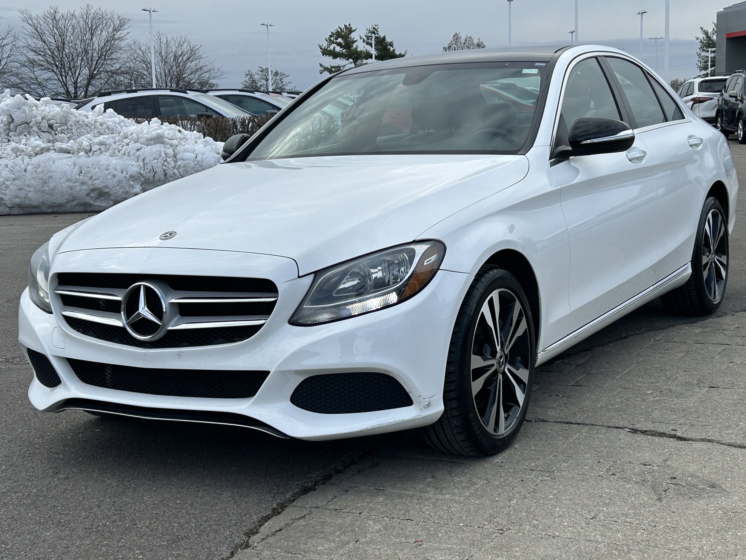 Polar White 2018 Mercedes-Benz C-Class C 300 4MATIC 9-Speed Automatic 2.0L I4 Turbocharged Clean Carfax, Sunroof | Moonroof, Leather, All Wheel Drive | AWD, Heated Seats, Local Trade, Hard to Find, Serviced Here, 4MATIC, 4-way Power Driver's Lumbar Support, 4-Wheel Disc Brakes, ABS brakes, Air Conditioning, Alloy wheels, Anti-whiplash front head restraints, Auto tilt-away steering wheel, Auto-dimming Rear-View mirror, Automatic temperature control, Brake assist, CD player, Child-Seat-Sensing Airbag, Delay-off headlights, Dual front impact airbags, Dual front side impact airbags, Electronic Stability Control, Emergency communication system: mbrace2, Exterior Parking Camera Rear, Front anti-roll bar, Front dual zone A/C, Fully automatic headlights, Garage door transmitter: Homelink, Genuine wood console insert, Genuine wood dashboard insert, Genuine wood door panel insert, Head restraints memory, Knee airbag, Low tire pressure warning, MB-Tex Upholstery, Memory seat, Occupant sensing airbag, Overhead airbag, Panic alarm, Power driver seat, Power Front Seats w/Driver Memory, Power moonroof, Power steering, Power windows, Premium audio system: COMAND, Radio data system, Radio: Audio 20, Rain sensing wipers, Rear anti-roll bar, Rear fog lights, Rear side impact airbag, Rear window defroster, Remote keyless entry, Security system, Single CD Player, Steering wheel memory, Steering wheel mounted audio controls, Variably intermittent wipers.