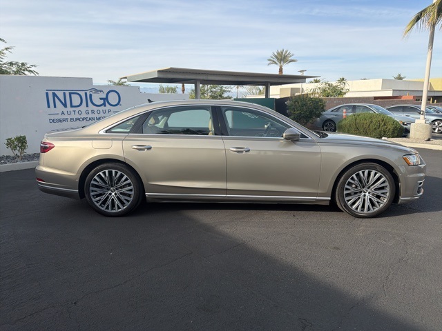 Audi Rancho Mirage is delighted to showcase this Pre-Owned 2019 Audi A8 L 55 TFSI quattro. Dressed in an evocative Savannah Beige Metallic and with just 46,953 miles to its name, this vehicle is a testament to the potent combination of high performance and sophistication that Audi embodies. The 2019 Audi A8 L 55 TFSI quattro stands as a beacon of design and innovation, with its long wheelbase silhouette cloaked in elegant Savannah Beige Metallic. This executive sedan includes distinctive exterior enhancements like the Chrome Exterior Package and HD Matrix-design LED Headlights with OLED Taillights. A Power Panoramic Sunroof and Dual Pane Acoustic, Break-Resistant Glass elevate both comfort and road presence. The cabin welcomes you with an exquisite Saiga Beige interior featuring Valetta Leather Seats, 22-way Multi-Contour Comfort Front Seats with ventilation and massage, and Four-Zone Automatic Climate Control. Premium touches include the Bang & Olufsen 3D Premium Sound System, Head-Up Display, and Power Sunshades for Rear and Side Windows. Technologies such as MMI Navigation with Touch Response, Virtual Cockpit, and Audi Phone Box with Wireless Charging make it a connected and luxurious driving experience. Powering the A8 L is a robust 3.0-liter TFSI V6 engine with 48V Mild Hybrid Technology, producing an impressive 335 horsepower and 369 miles of torque. This power is harnessed by Audi’s quattro system and delivered through an 8-speed transmission for a smooth yet commanding ride.