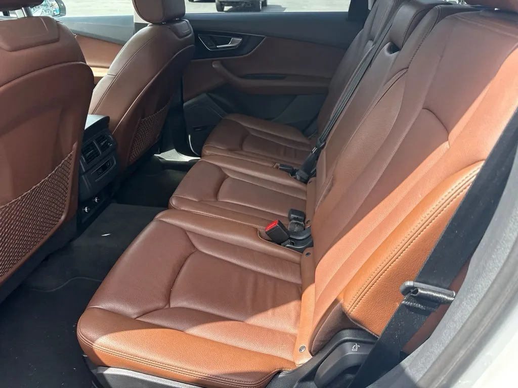 Experience luxury and performance in this 2019 Audi Q7 55 SE Premium Plus, a versatile SUV designed to elevate your driving experience. With a refined 3.0-liter supercharged V6 engine delivering 329 horsepower and 325 lb-ft of torque, this vehicle offers impressive power combined with fuel efficiency, rated at 19 MPG city and 25 MPG highway. Boasting a spacious 7-passenger seating with plush Nougat Brown leather seats, it features a variety of premium amenities including a panoramic sunroof, heated seats, and a hands-free liftgate for added convenience. Modern technology is at your fingertips with Apple CarPlay, satellite radio, a 10.1-inch infotainment screen, and a premium 18-speaker audio system, ensuring entertainment and connectivity on every journey. The SUV’s advanced safety features, such as blind spot monitoring, collision warning, and a backup camera, provide peace of mind, while the quattro all-wheel drive and 8-speed Tiptronic transmission deliver smooth handling and confident driving in diverse conditions. This used Audi Q7 is equipped with a host of convenience features including keyless entry, wireless phone charging, a rear A/C system, and rear sunshade for passenger comfort. Its tow package enhances versatility, making it suitable for both daily commuting and weekend getaways. The vehicle’s sophisticated interior boasts memory seats and a premium audio system, creating a luxurious environment for all occupants. With its combination of style, technology, and capability, this SUV is a compelling choice for those seeking a high-end vehicle that performs well on the road and offers modern comforts.