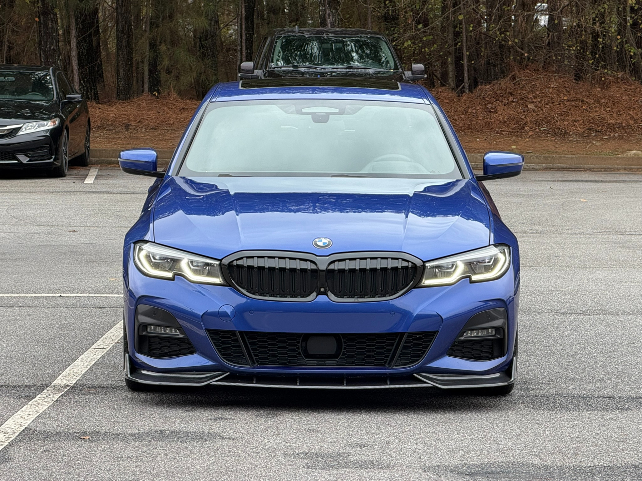 2019 BMW 330i, Portimao Blue Metallic on black, featuring the M Sport Package with 19" M Double-Spoke bi-color wheels, performance run-flat tires, M Sport suspension, variable sport steering, aerodynamic kit, shadowline exterior trim, M steering wheel, and increased top-speed limiter. Equipped with Vernasca leather upholstery, aluminum tetragon interior trim, Live Cockpit Pro with navigation and Apple CarPlay, Harman/Kardon surround sound, ambient lighting, Sensatec dashboard, SiriusXM, remote engine start, heated front seats, and heated steering wheel. Additional premium features include the Premium Package with head-up display and Connected Package Pro, the Executive Package with surround view 3D camera, park distance control, automatic high beams, gesture control, BMW Laserlight, and Parking Assistant Plus. Driving Assistance Professional Package adds active cruise control with stop & go, active lane keeping assistant with side-collision avoidance, traffic jam assist, evasion aid, and speed limit info. Includes active blind spot detection, rear view camera, LED headlights with cornering lights, LED fog lights, comfort access keyless entry, and all advanced safety and convenience technology BMW offers in the 3-Series lineup.