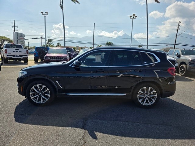 This BMW X3 has many features and is well equipped including 8-Speed Automatic, 12 Speakers, 3.39 Axle Ratio, 4-Wheel Disc Brakes, ABS brakes, Active Blind Spot Detection, Active Driving Assistant, Advanced Real-Time Traffic Information, Air Conditioning, Alloy wheels, AM/FM radio, Ambient Lighting, Apple CarPlay Compatibility, Auto-dimming door mirrors, Auto-dimming Rear-View mirror, Automatic temperature control, Brake assist, Bumpers: body-color, Comfort Access Keyless Entry, Delay-off headlights, Driver door bin, Driver vanity mirror, Dual front impact airbags, Dual front side impact airbags, Electronic Stability Control, Emergency communication system: BMW Assist eCall, Exterior Parking Camera Rear, Four wheel independent suspension, Front anti-roll bar, Front Bucket Seats, Front Center Armrest, Front dual zone A/C, Front fog lights, Front reading lights, Fully automatic headlights, Garage door transmitter, Genuine wood dashboard insert, Genuine wood door panel insert, Hands-Free Bluetooth & USB Audio Connection, Head-Up Display, Heated door mirrors, Heated Front Seats, Heated Steering Wheel, Hi-Fi Sound System, Illuminated entry, Knee airbag, Lane Departure Warning System, LED Headlights w/Cornering Lights, Low tire pressure warning, Lumbar Support, Memory seat, Navigation System, Occupant sensing airbag, Outside temperature display, Overhead airbag, Panic alarm, Panoramic Moonroof, Passenger door bin, Passenger vanity mirror, Power door mirrors, Power driver seat, Power Front Seats, Power Liftgate, Power passenger seat, Power steering, Power windows, Radio data system, Radio: AM/FM Stereo w/HD, Rain sensing wipers, Rear air conditioning, Rear anti-roll bar, Rear reading lights, Rear seat center armrest, Rear window defroster, Rear window wiper, Remote keyless entry, Remote Services, Roof rack: rails only, Security system, SensaTec Upholstery, SiriusXM Satellite Radio, Speed control, Speed-sensing steering, Speed-Sensitive Wipers, Split folding rear seat, Spoiler, Sport Bucket Seats, Sport Leather Steering Wheel, Sport steering wheel, Steering wheel mounted audio controls, Tachometer, Telescoping steering wheel, Tilt steering wheel, Traction control, Trip computer, Turn signal indicator mirrors, Variably intermittent wipers, Wheels: 18" x 7.0" Y-Spoke (Style 688), and Wheels: 19" x 7.5" V-Spoke (Style 692) Jet Black 2019 BMW X3 sDrive30i RWD 8-Speed Automatic 2.0L I4 TwinPower Turbo 8-Speed Automatic.