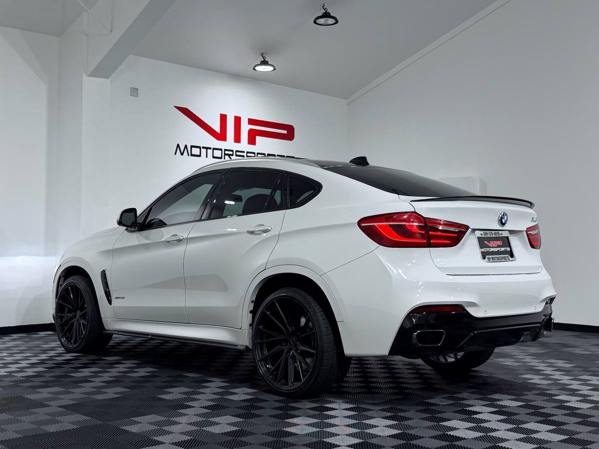 Our hard-to-find Accident Free 2019 BMW X6 xDrive50i makes a commanding statement in Alpine White! Powered by a TurboCharged 4.4 Liter TwinPower V8 that offers 445hp tethered to a paddle-shifted 8 Speed Sport Automatic transmission with Sport/Manual modes and launch control. This All Wheel Drive SUV sends you to 60mph in just 4.6 seconds plus shows off nearly 21mpg on the highway. Our xDrive50i flaunts its powerful performance with bold looks that refuse to be ignored! Examine our photos and admire the distinct alloy wheels, LED fog lights, sunroof, chrome exhaust tips, and xenon adaptive headlights. Open the xDrive50i door to refinement and luxury in a spacious cabin that features multi-contour Dakota leather seats with 3-stage heating functions, ambient lighting, 4-zone automatic climate control, a sunroof, Advanced Key, a multi-function sport steering wheel, and split-folding rear seats. A safe connection is at your fingertips with our iDrive system touchscreen, a touchpad controller, high-resolution navigation, Bluetooth phone/audio connectivity, integrated smartphone apps, and a Harman Kardon sound system with HD and available satellite radio. This BMW comes well-equipped with safety features to help you avoid and manage challenging driving situations as you make your way. BMW Assist emergency communications, stability/traction control, advanced airbags, and rear parking sensors offer peace of mind. Reward yourself with this X6 xDrive50i for an ideal blend of brilliant driving dynamics, awesome utility, and absolute comfort. Save this Page and Call for Availability. We Know You Will Enjoy Your VIP Motorsports Test Drive Towards Ownership!