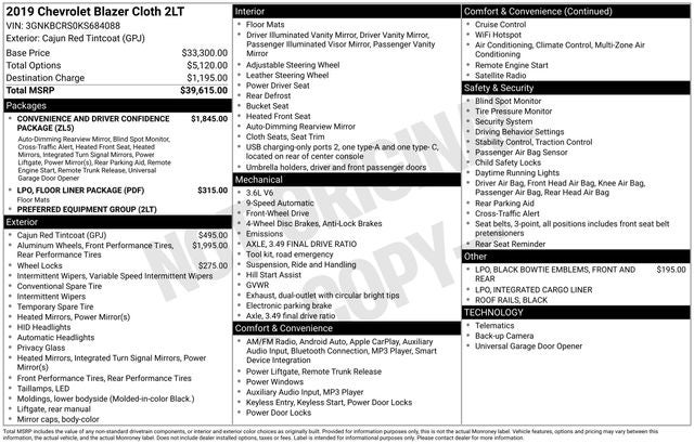 Introducing the 2019 Chevrolet Blazer Base 2LT, a versatile and well-equipped SUV that's ready to elevate your driving experience. With its sleek design, powerful performance, and an array of premium features, this Blazer is the perfect companion for your adventures. Under the hood, this Blazer is powered by a 3.6L V6 SIDI DOHC VVT engine, delivering a spirited 9-speed automatic transmission and confident front-wheel drive performance. With an impressive 20 city/26 highway MPG, you'll enjoy the perfect balance of power and efficiency. Step inside and you'll be greeted by a spacious and well-appointed cabin, featuring premium cloth seating, dual-zone automatic climate control, and a state-of-the-art Chevrolet Infotainment 3 system with Apple CarPlay and Android Auto connectivity. The Convenience and Driver Confidence Package adds a wealth of advanced safety and convenience features, including Lane Change Alert with Side Blind Zone Alert, Rear Cross Traffic Alert, and a power programmable liftgate. Designed to handle your everyday adventures with ease, the 2019 Chevrolet Blazer Base 2LT offers the perfect blend of style, performance, and technology. With its impressive list of features and the confidence of Chevrolet's renowned engineering, this Blazer is ready to elevate your driving experience. We invite you to visit our showroom and experience the 2019 Chevrolet Blazer Base 2LT for yourself. Let us demonstrate how this exceptional SUV can enhance your daily commute and weekend getaways. We're confident you'll be impressed by its capabilities and eager to make it your own.