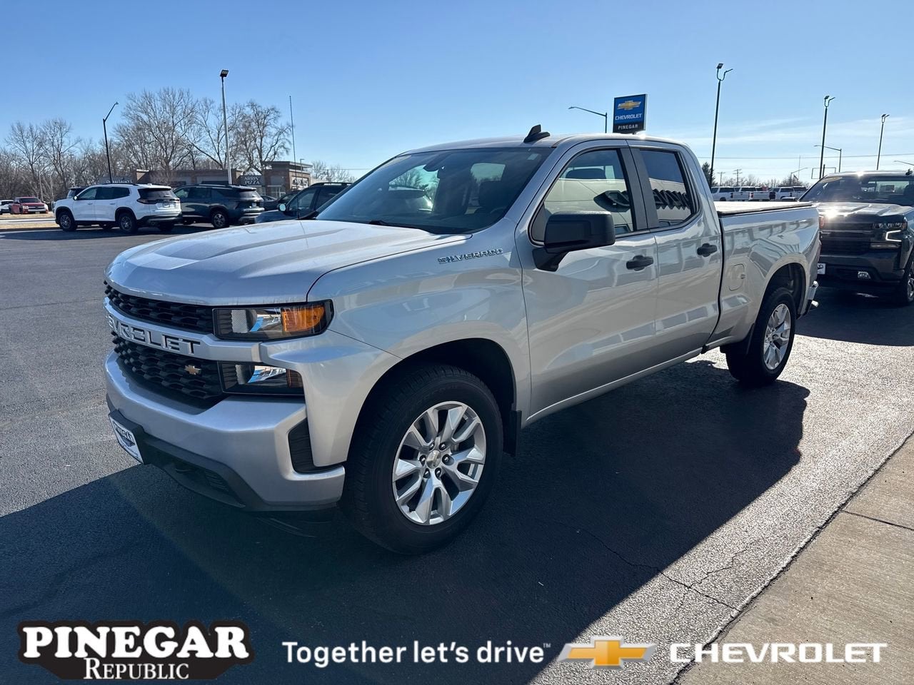 Priced below KBB Fair Purchase Price! Clean Carfax. Carfax One-Owner. Silver Ice Metallic 2019 Chevrolet Silverado 1500 Custom 6-Speed Automatic Electronic with Overdrive EcoTec3 4.3L V6 RWD Silverado 1500 Custom, 4D Double Cab, EcoTec3 4.3L V6, 6-Speed Automatic Electronic with Overdrive, RWD, Silver Ice Metallic, Black Cloth, 170 Amp Alternator, 3.5 Diagonal Monochromatic Display, 4-Wheel Disc Brakes, ABS brakes, Air Conditioning, Alloy wheels, Apple CarPlay/Android Auto, Bluetooth For Phone, Body Color Grille, Brake assist, Chevrolet Connected Access, Chevrolet w/4G LTE, Color-Keyed Carpeting Floor Covering, Compass, Deep-Tinted Glass, Dual front impact airbags, Dual front side impact airbags, Electronic Cruise Control, Exterior Parking Camera Rear, Front Frame-Mounted Black Recovery Hooks, Front Rubberized Vinyl Floor Mats, Fully automatic headlights, Heated door mirrors, Infotainment Package, Locking Tailgate, Manual Tilt Wheel Steering Column, OnStar & Chevrolet Connected Services Capable, Panic alarm, Power Door Locks, Power door mirrors, Power Front Windows w/Driver Express Up/Down, Power Front Windows w/Passenger Express Down, Power Rear Windows w/Express Down, Preferred Equipment Group 1CX, Premium audio system: Chevrolet Infotainment System 3, Radio: Chevrolet Infotainment 3 System, Rear 60/40 Folding Bench Seat (Folds Up), Rear Rubberized-Vinyl Floor Mats, Remote Keyless Entry, Remote keyless entry, SiriusXM Radio, Speed control, Wheels: 20 x 9 Bright Silver Painted Aluminum. Ask about 20% off select maintenance at our Republic Location! Recent Arrival! Odometer is 70537 miles below market average!