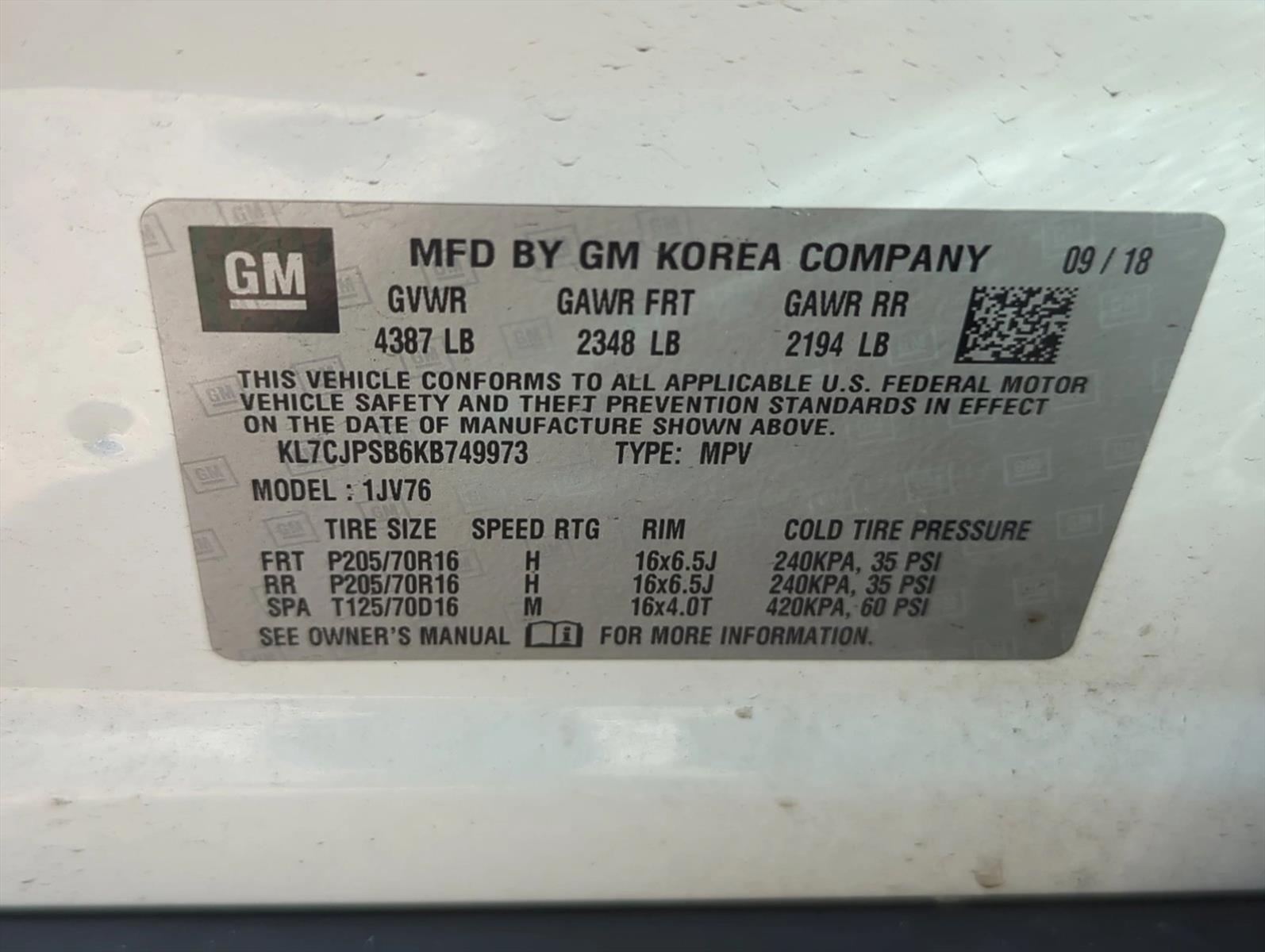 VIN: KL7CJPSB6KB749973