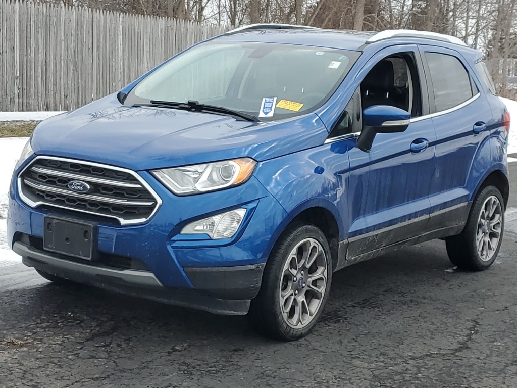 2019 Ford EcoSport Titanium CARFAX One-Owner. Clean CARFAX. ABS brakes, AppLink/Apple CarPlay and Android Auto, Auto-dimming Rear-View mirror, Automatic temperature control, Electronic Stability Control, Emergency communication system: SYNC 3 911 Assist, Exterior Parking Camera Rear, Front fog lights, Fully automatic headlights, Heated door mirrors, Heated front seats, Heated steering wheel, Illuminated entry, Navigation System, Perforated Leather-Trimmed Heated Bucket Seats, Power driver seat, Power moonroof, Remote keyless entry, SiriusXM Radio, SiriusXM Traffic & Travel Link, Split folding rear seat, Steering wheel mounted audio controls, SYNC 3 Communications & Entertainment System, Turn signal indicator mirrors, Wheels: 17" Premium Dark Stainless-Painted. Odometer is 8102 miles below market average! 23/29 City/Highway MPG Coming Soon! This vehicle has recently been acquired and we are currently processing the paperwork, servicing the vehicle, and taking more photos. It will be available for sale and delivery shortly. See a store manager for specific details on the current status. IMPORTANT RECALL INFORMATION. Some vehicles may be subject to unrepaired safety recalls. Go to the www.safercar.gov to learn whether an individual vehicle is available.