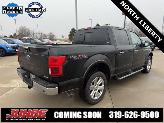 2019 Agate Black Metallic Ford Lariat F-150. Junge is committed to providing a best-in-class experience to our customers and employees! Respectful - fair - loyal. Our goal is to be the area's top choice for automotive sales & service! CARFAX One-Owner. Clean CARFAX. 4WD 10-Speed Automatic 3.5L V6 EcoBoost. Accident free Auto Check, one owner, sunroof/moonroof, navigation/GPS, local trade, leather, crew cab, 4WD.