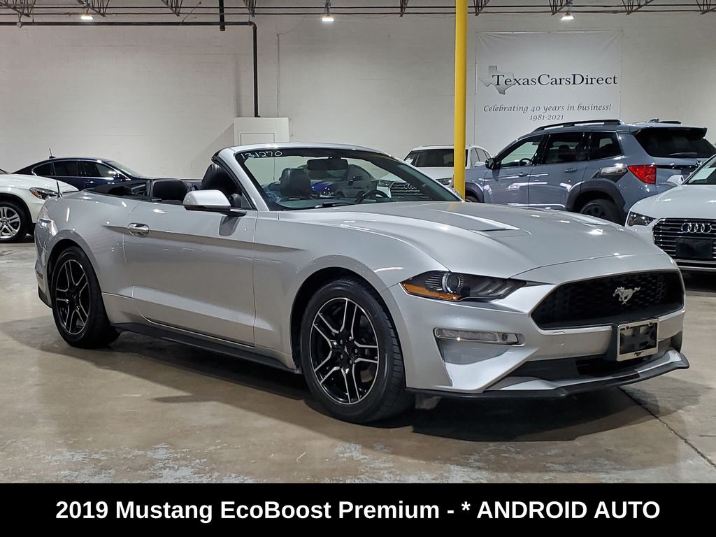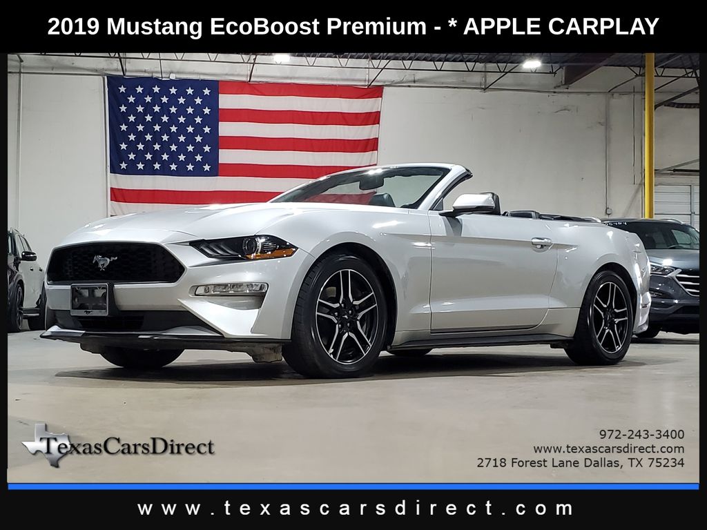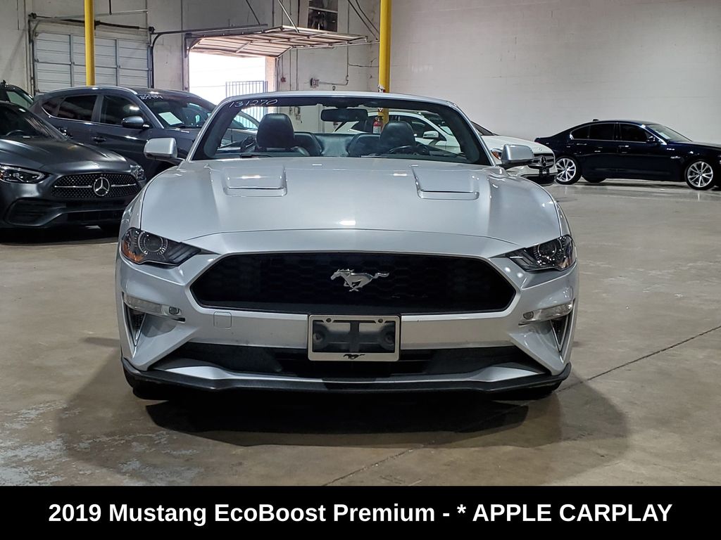 Elevate your driving experience with this stunning 2019 Ford Mustang EcoBoost Premium Convertible/Auto/Apple/HTD-Cold LTHR. This sleek and powerful sports car boasts a captivating Silver exterior, complemented by a host of premium features that will make every journey a true delight. Powered by the efficient and responsive EcoBoost 2.3L I4 GTDi DOHC Turbocharged VCT engine, this Mustang delivers an impressive 20 city / 28 highway MPG, ensuring you can conquer the open road with confidence and efficiency. Step inside the cabin and experience the epitome of comfort and convenience. Sink into the plush, leather-wrapped seats and enjoy the climate-controlled heating and cooling, as well as the SYNC 3 Communications & Entertainment System, which seamlessly integrates your smartphone via Apple CarPlay and Android Auto. Safety is paramount, and this Mustang delivers with a comprehensive suite of advanced features, including ABS brakes, Electronic Stability Control, and a Rear View Camera, giving you the confidence to navigate the roads with ease. Elevate your driving experience and make a statement with this exceptional 2019 Ford Mustang EcoBoost Premium Convertible/Auto/Apple/HTD-Cold LTHR. We invite you to schedule a test drive and discover the thrill of owning this exceptional sports car.