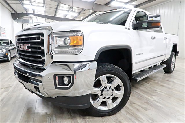 This 2019 GMC Sierra 2500HD SLT Crew Cab 4WD features a clean Carfax and is equipped with a Duramax 6.6L V8 Turbo Diesel engine. It includes a 6-speed automatic transmission, navigation, and a Bose premium sound system.