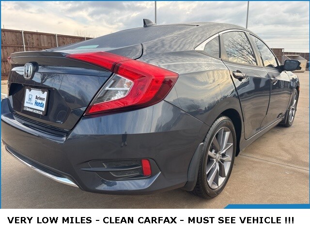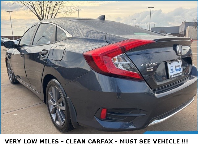2019 Honda Civic EX-L Modern Steel Metallic 1.5L I-4 DI DOHC Turbocharged CVT FWD 32/42 City/Highway MPG. Never a Rental, Local Trade, Regular Oil Changes, Alloy Wheels, Backup Camera, Smoke Free Vehicle, clean carfax, Black w/Leather-Trimmed Seating Surfaces, Alloy wheels, Exterior Parking Camera Rear, Power moonroof. Clean CARFAX. This vehicle has been through an extensive multi-point inspection by an ASE Certified Technician. All necessary services have been done for the appropriate mileage interval as deemed necessary. We have also reconditioned this vehicle inside and out to provide you with as near a new car experience as can be expected from a vehicle of this year and mileage. Buy with confidence. Locally operated Dealership. As a leading Honda dealer in DFW, our name has become synonymous with honesty and integrity. We have grown into one of the largest Honda dealers in the Dallas and Fort Worth area. We are proud to be integral members of the Dallas-Fort Worth community, where we serve the entire DFW Metroplex, including Burleson, Cleburne, Carrollton, North Richland Hills, Irving, Frisco, Richardson, Plano, Grand Prairie, Grapevine and the entire North Texas area.