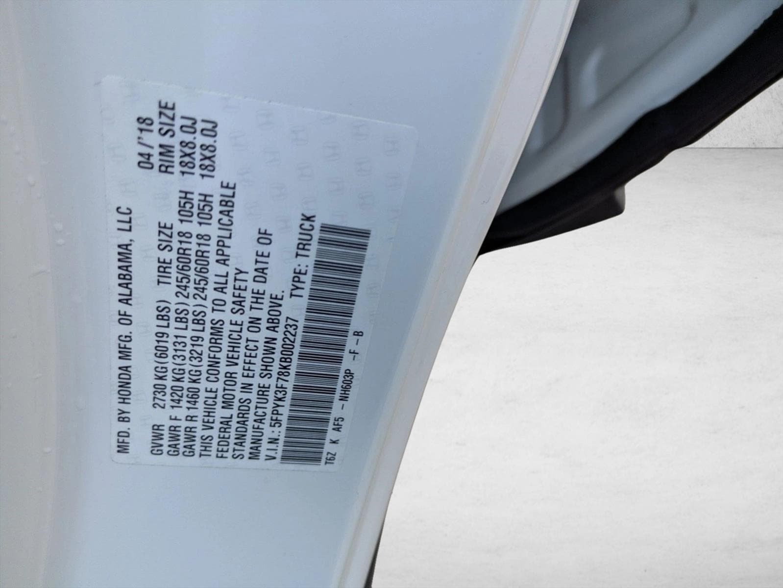 VIN: 5FPYK3F78KB002237