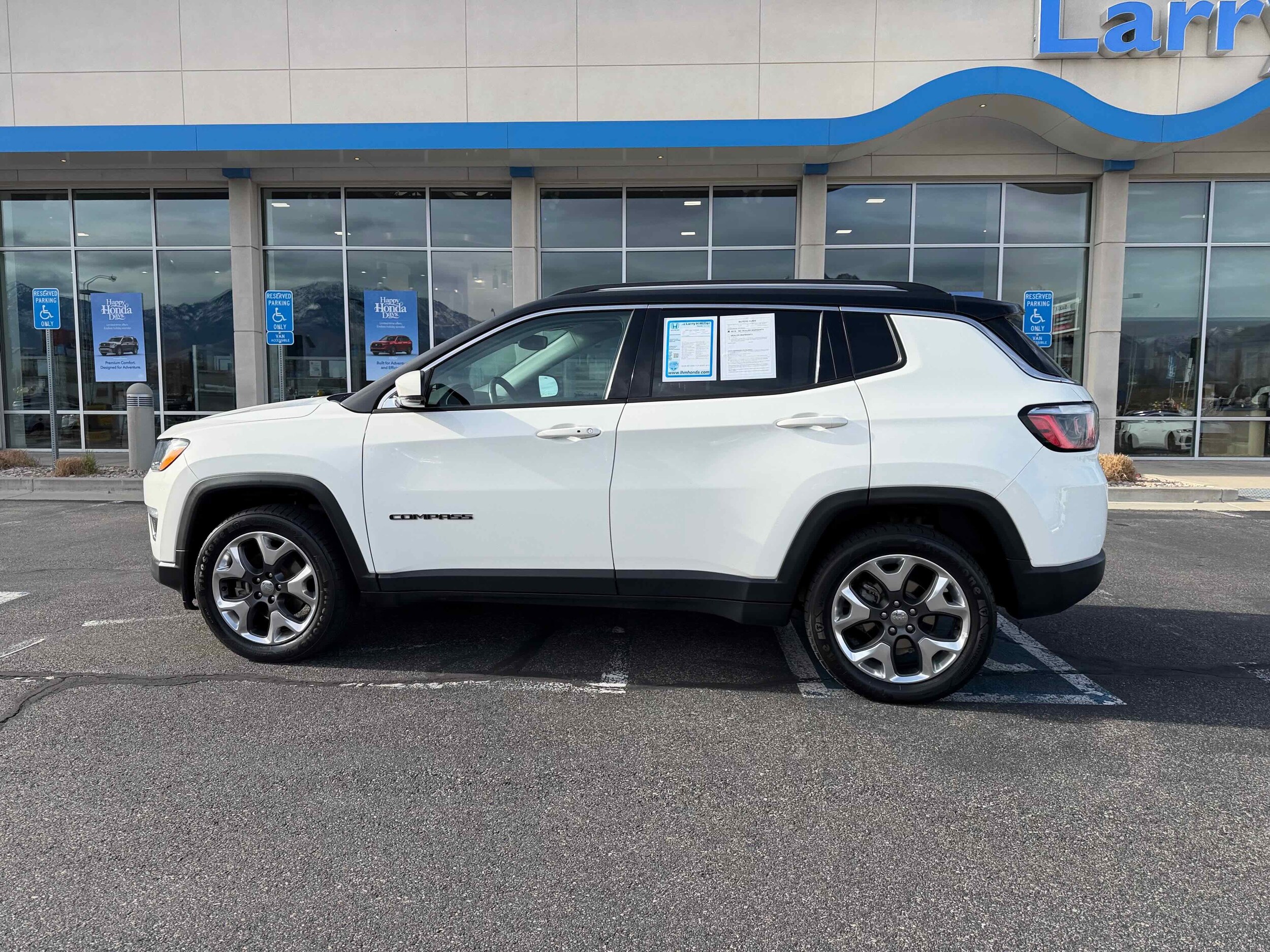 4WD. Recent Arrival! Larry H. Miller Honda Murray offers this 2019 White Clearcoat Jeep Compass Limited 4WD. It is loaded with many standard and optional features including: Quick Order Package 27G (DISC), 4WD, 3.73 Axle Ratio, 4-Wheel Disc Brakes, 6 Speakers, ABS brakes, Air Conditioning, Alloy wheels, AM/FM radio: SiriusXM, Anti-whiplash front head restraints, Apple CarPlay/Android Auto, Auto-dimming Rear-View mirror, Automatic temperature control, Brake assist, Bumpers: body-color, Compass, Delay-off headlights, Driver door bin, Driver vanity mirror, Dual front impact airbags, Dual front side impact airbags, Electronic Stability Control, Four wheel independent suspension, Front anti-roll bar, Front Bucket Seats, Front Center Armrest w/Storage, Front dual zone A/C, Front fog lights, Front reading lights, Fully automatic headlights, Google Android Auto, GPS Antenna Input, Heated door mirrors, Heated front seats, Heated steering wheel, Illuminated entry, Knee airbag, Leather Shift Knob, Leather Trimmed Bucket Seats, Low tire pressure warning, Manufacturer's Statement of Origin, Occupant sensing airbag, Outside temperature display, Overhead airbag, Overhead console, Panic alarm, ParkView Rear Back-Up Camera, Passenger door bin, Passenger vanity mirror, Power door mirrors, Power driver seat, Power steering, Power windows, Radio: Uconnect 4 w/8.4 Display, Rear anti-roll bar, Rear seat center armrest, Rear window defroster, Rear window wiper, Remote keyless entry, Roof rack: rails only, Security system, Speed control, Split folding rear seat, Spoiler, Steering wheel mounted audio controls, Tachometer, Telescoping steering wheel, Tilt steering wheel, Traction control, Trip computer, Turn signal indicator mirrors, USB Host Flip, Variably intermittent wipers, and Wheels: 18 x 7.0 Polished/Gray Pockets Aluminum.