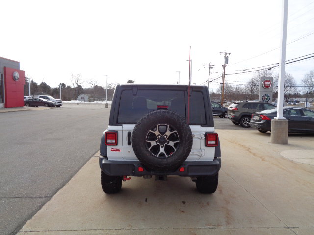 This pre-owned 2019 Jeep Wrangler Unlimited Rubicon is available at our dealership in Bangor, Maine. The vehicle features a Bright White Clearcoat exterior and a black interior. It is equipped with a 3.6L V6 engine, four wheel drive, and a six-speed manual transmission. The Wrangler Unlimited offers a convertible experience with a manual convertible top and a full-size spare tire. Please check with the dealer to confirm vehicle availability.