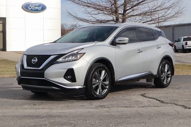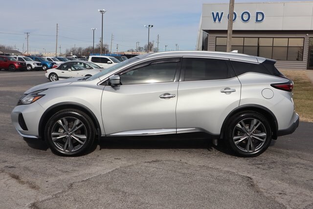 Brilliant Silver Metallic 2019 Nissan Murano Platinum FWD CVT with Xtronic 3.5L V6 DOHC 24V CVT with Xtronic, 11 Speakers, 4.667 Axle Ratio, Air Conditioning, AM/FM radio: SiriusXM, AM/FM/CD/MP3/WMA Audio System, Auto High-beam Headlights, Automatic temperature control, Blind Spot Warning, Brake assist, Bumpers: body-color, CD player, Compass, Delay-off headlights, Driver door bin, Driver vanity mirror, Electronic Stability Control, Front Bucket Seats, Front Center Armrest, Front dual zone A/C, Front fog lights, Front reading lights, Fully automatic headlights, Garage door transmitter: HomeLink, Heated door mirrors, Heated front seats, Heated rear seats, Heated steering wheel, Illuminated entry, Low tire pressure warning, Memory seat, Navigation System, NissanConnect Services Powered By SiriusXM, Outside temperature display, Overhead console, Panic alarm, Passenger door bin, Passenger vanity mirror, Power door mirrors, Power driver seat, Power Liftgate, Power moonroof, Power passenger seat, Power steering, Power windows, Radio data system, Rear reading lights, Rear seat center armrest, Rear window defroster, Rear window wiper, Remote keyless entry, Security system, Semi-Aniline Leather-Appointed Seat Trim, Speed control, Speed-Sensitive Wipers, Splash Guards, Split folding rear seat, Spoiler, Steering wheel memory, Steering wheel mounted audio controls, Tachometer, Telescoping steering wheel, Tilt steering wheel, Trip computer, Turn signal indicator mirrors, Variably intermittent wipers, Ventilated front seats, Wheels: 20" Dark Hyper Silver. Wood Motor is proud to serve our communities in Southwest Missouri, Northwest Arkansas, Northeast Oklahoma, and Southeast Kansas. The ultimate commitment to our customers is to deliver an experience that's with ease in negotiation, a transparent buying process, while also earning a customer for life.