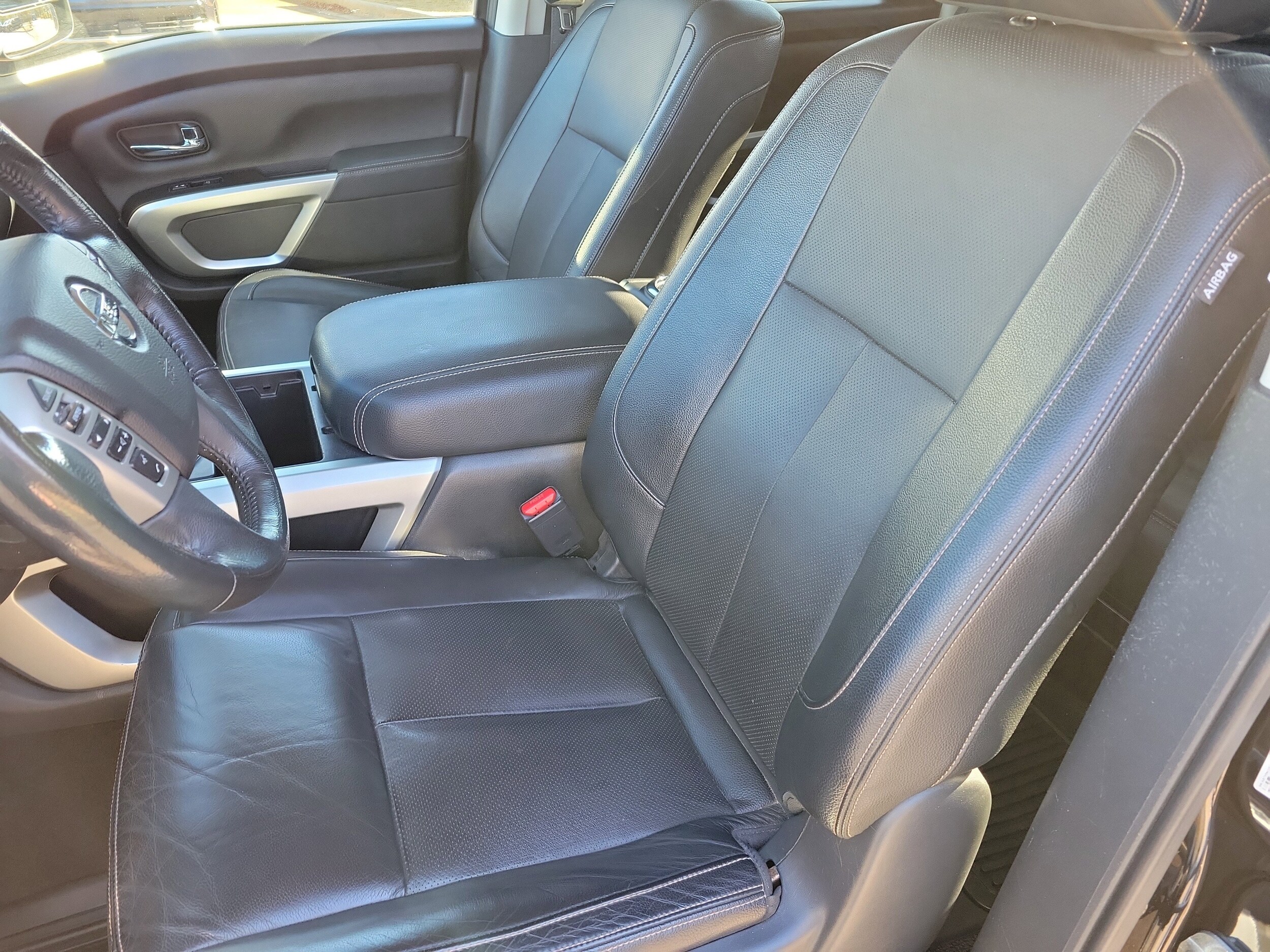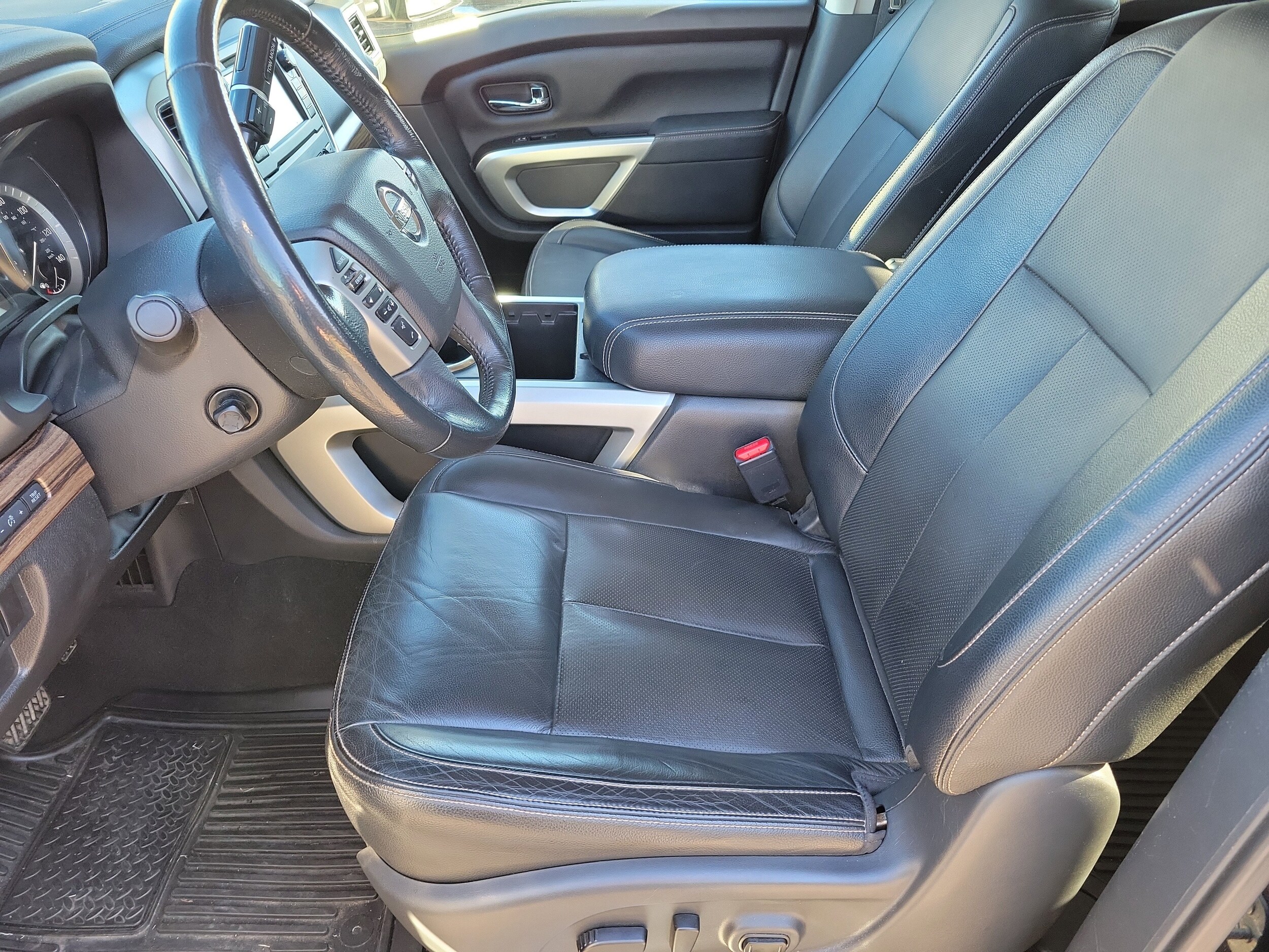 Magnetic Black Metallic 2019 Nissan Titan SL RWD 4-S 5.6L V8. The Titan is the perfect truck in my opinion. It drives like a truck from the 2000s with its non electric pump driven steering. Tracks down the highway smoothly and straight as an arrow. The engine is fantastic and the transmission is eager to move. The truck is well built and tight as a drum. The steering is heavy and I personally like that. The safety features are awesome compared to other manufacturers and I don’t find them obstructive in anyway. The seats are the best part. Buying lots of new vehicles over the past decade, one can’t help but notice how hard modern seats are. Not the Titan, like sitting in your favorite lazy boy. Second best feature is the fender audio system, hands down best audio I’ve heard in a vehicle from the factory, and I had a Lexus with Mark levinson sound. The headlights with height adjustability for trailering are fantastic.