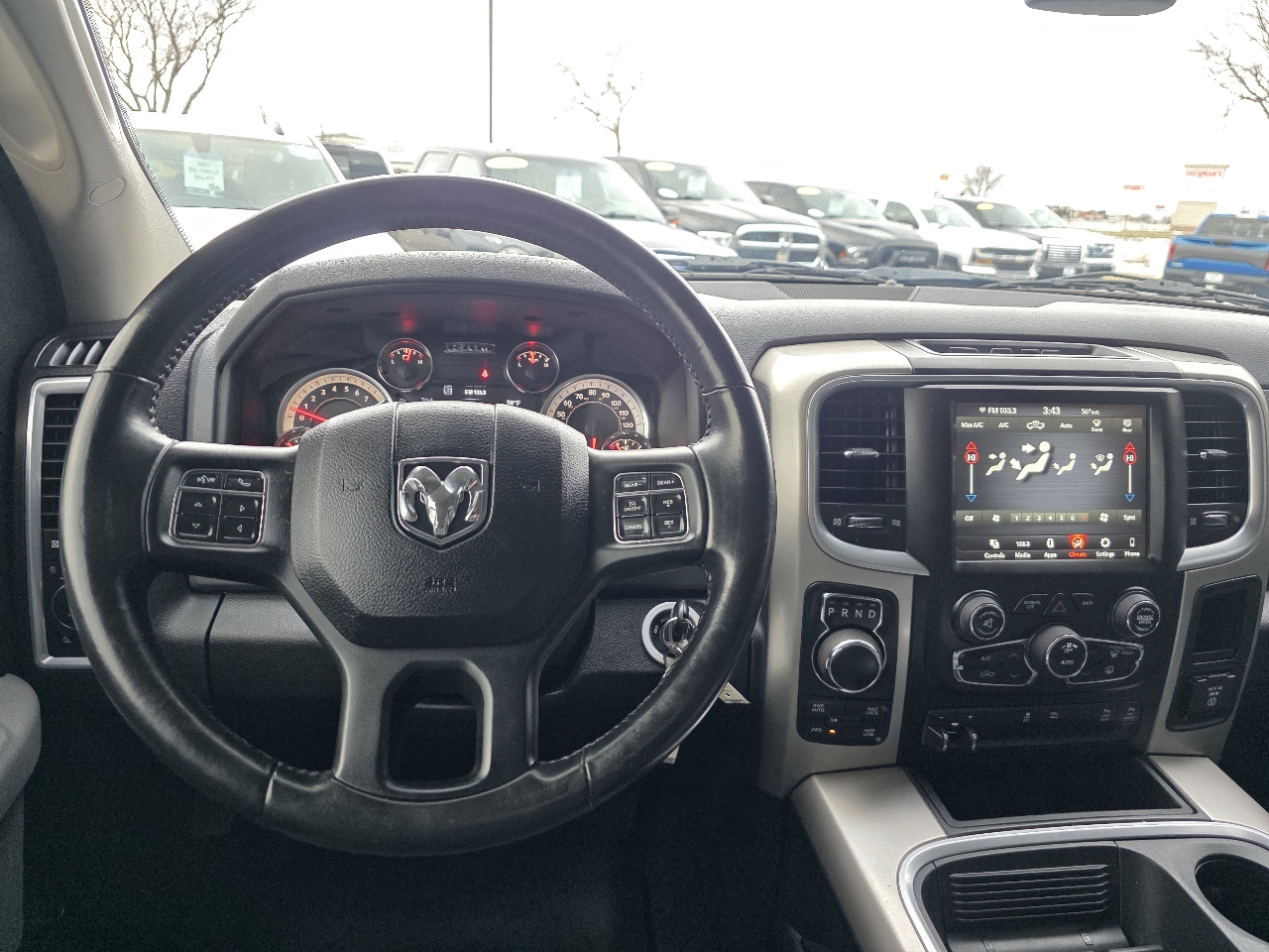 This Big Horn Crew Cab offers a spacious, comfort-focused interior with a power driver seat, leather-wrapped steering wheel, full-length floor console, and rear folding seats with under-seat storage. It features Uconnect, a backup camera, LED interior lighting, and a power sliding rear window for added convenience. Additional options include ParkSense Rear Park Assist, Anti-Spin Differential Axle, Class IV Hitch, and Trailer Brake Control, giving you added capability while keeping the cabin comfortable and functional. A clean, well-equipped truck with strong interior features and Big Horn upgrades.