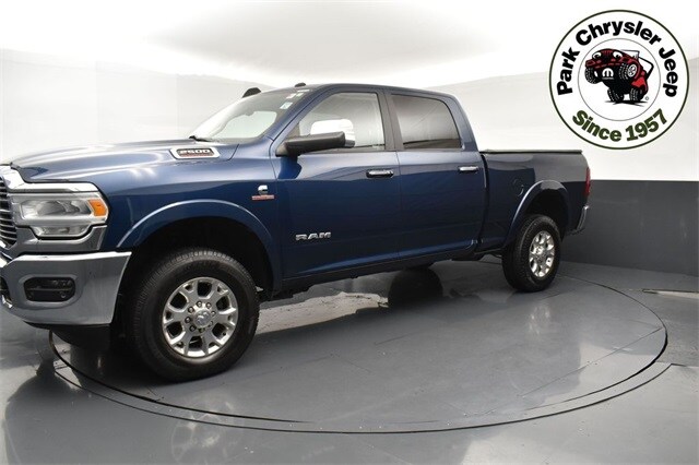 Our Diesel powered Accident Free, One Owner 2019 RAM 2500 Laramie Crew Cab 4X4 puts bold capability and comfort at your command in Blue Streak Pearl Coat! Motivated by a TurboCharged 6.7 Liter Cummins Diesel 6 Cylinder that offers 370hp and 850lb-ft of torque to 6 Speed Automatic transmission for impressive pulling potential. This Four Wheel Drive truck also has composed handling for the confidence to take on big jobs without breaking a sweat. A premium design helps our RAM 2500 stand out even further with LED lighting, fog lamps, a chrome billet grille, chrome bumpers, matching mirror caps, a damped tailgate, a drop-in bedliner, tonneau cover, and alloy wheels. Practicality and premium amenities greet you inside our Laramie cabin. Highlights include heated leather power front seats, a heated leather steering wheel, dual-zone automatic climate control, ambient lighting, keyless entry/ignition, remote start, a 7-inch driver display, and a power sliding rear window. You're ready to connect, too, with an 8.4-inch touchscreen, Android Auto/Apple CarPlay, Bluetooth, voice control, and a 10-speaker sound system. Clever storage helps you stay organized on the move! RAM supports your safety on the job or off with a rearview camera, front/rear parking sensors, ABS, stability/traction control, hill-start assist, trailer sway control, trailer sway control, and more. You can face the day head-on and work smarter with our 2500 Laramie. Save this Page and Call for Availability. We Know You Will Enjoy Your Park Chrysler Jeep Used Test Drive Towards Ownership!