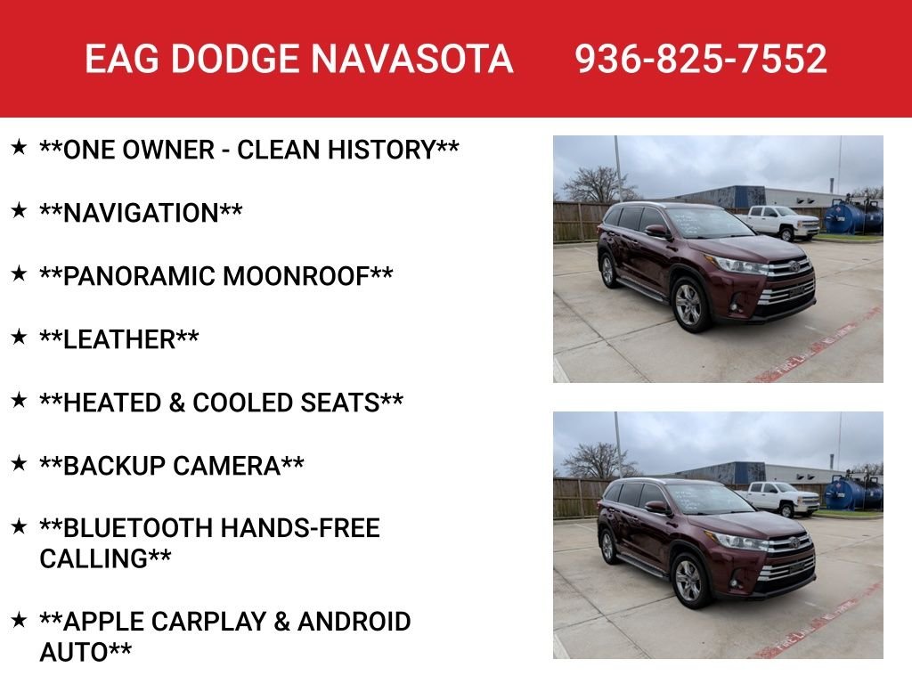 Discover the perfect blend of style, comfort, and advanced technology in this stunning 2019 Toyota Highlander Limited. With its commanding presence and exceptional features, this SUV is ready to elevate your driving experience. Powered by a robust 3.5L V6 engine and an 8-speed automatic transmission, the Highlander Limited delivers an impressive balance of power and efficiency, with an EPA-estimated 21 city/27 highway MPG. Its sleek exterior in the vibrant Red color exudes a sense of sophistication, while the spacious and well-appointed interior offers seating for up to eight passengers, ensuring ample room for your family and friends. Experience the ultimate in comfort and convenience with the Highlander's wealth of premium features. The panoramic moonroof floods the cabin with natural light, while the heated and ventilated front seats provide unparalleled relaxation. The state-of-the-art navigation system and 12-speaker JBL audio system elevate your driving experience, and the 360-degree camera and advanced safety technologies, such as Adaptive Cruise Control and Lane-Keeping Assist, provide added peace of mind on the road. Whether you're embarking on a family adventure or navigating the daily commute, this 2019 Toyota Highlander Limited is the perfect companion. Its exceptional blend of style, comfort, and cutting-edge features make it a true standout in the SUV segment. We invite you to experience the difference for yourself and schedule a test drive today.