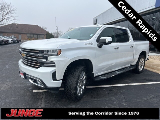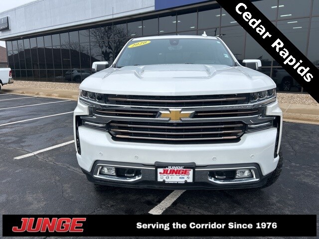 Junge is committed to providing a best-in-class experience to our customers and employees! Respectful - fair - loyal. 2020 Chevrolet Silverado 1500 High Country Iridescent Pearl Tricoat. High Country 4WD 10-Speed Automatic, 4WD, Jet Black Leather, 10-Way Power Driver Seat w/Lumbar, 10-Way Power Passenger Seat Adjuster w/Lumbar, 12-Volt Rear Auxiliary Power Outlet, 120-Volt Bed Mounted Power Outlet, 120-Volt Instrument Panel Power Outlet, 15" Diagonal Multicolor Head-Up Display, 170 Amps Alternator, 2nd Row Heated Outboard Seats, 3.23 Rear Axle Ratio, 4-Wheel Disc Brakes, 4G LTE Wi-Fi Hot Spot Capable, 7 Speakers, 8" Driver Information Center, ABS brakes, Adaptive Cruise Control - Camera, Advanced Trailering System, Air Conditioning, All-Weather Floor Liner (LPO), Alloy wheels, AM/FM radio: SiriusXM with 360L, Apple CarPlay/Android Auto, Auto-dimming door mirrors, Auto-Dimming Inside Rear-View Mirror, Auto-dimming Rear-View mirror, Automatic Emergency Braking, Automatic temperature control, Auxiliary External Transmission Oil Cooler, Bed View Camera, Bluetooth For Phone, Brake assist, Bumpers: body-color, Chevrolet Connected Access Capable, Chevytec Spray-On Black Bedliner, Chrome Assist Steps, Chrome Grille, Chrome Recovery Hooks, Color-Keyed Carpeting Floor Covering, Compass, Deep-Tinted Glass, Delay-off headlights, Driver door bin, Driver Memory, Driver vanity mirror, Dual Exhaust w/Polished Outlets, Dual front impact airbags, Dual front side impact airbags, Electric Rear-Window Defogger, Electrical Lock Control Steering Column, Electronic Stability Control, Floor Mounted Center Console, Following Distance Indicator, Forward Collision Alert, Front anti-roll bar, Front Bucket Seats, Front Carpeted Floor Mats, Front Center Armrest, Front dual zone A/C, Front fog lights, Front LED Fog Lamps, Front License Plate Kit, Front Pedestrian Braking, Front reading lights, Front wheel independent suspension, Fully automatic headlights, Garage door transmitter, HD Radio, HD Rear Vision Camera, HD Surround Vision w/2 Trailer View Camera Provisions, Heated door mirrors, Heated Driver & Front Outboard Passenger Seats, Heated front seats, Heated rear seats, Heated Steering Wheel, Heated steering wheel, Heavy Duty Suspension, Heavy-Duty Rear Locking Differential.