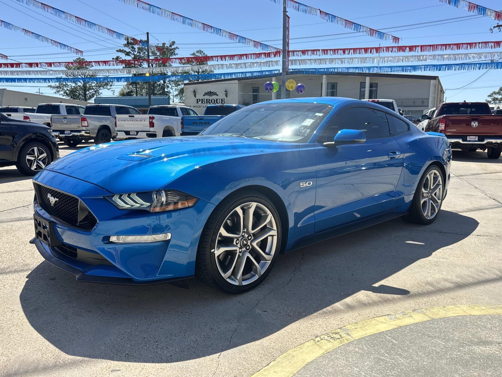 Blue 2020 Ford Mustang GT Premium 6-Speed Manual RWD. This vehicle features a 5.0L engine and offers a blend of performance and comfort with its Ebony interior. The Mustang is known for its iconic design and powerful engine, making it a standout in the sports car market.