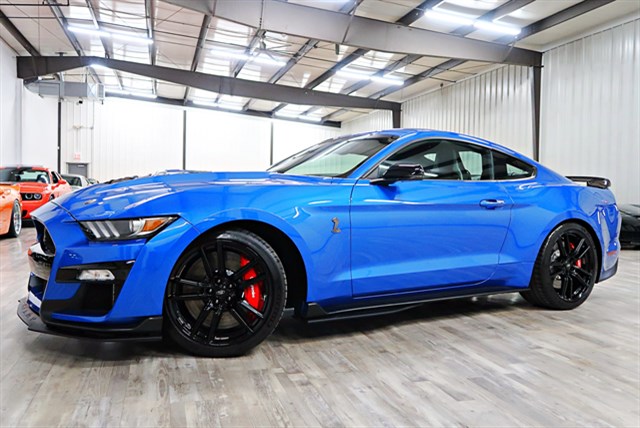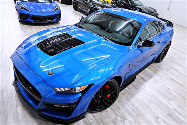 The 2020 Ford Shelby GT500 is a high-performance vehicle with a clean Carfax and only 325 miles. It features a 5.2L supercharged V8 engine with 760HP, a 7-speed dual-clutch transmission, and Brembo brake calipers. The exterior is Velocity Blue Metallic, and the interior is Ebony with Smoke Gray accents.