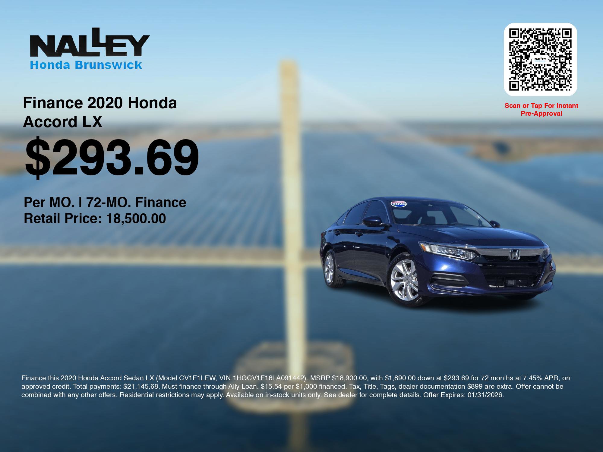 Discover Honda Accord LX Exceptional Savings at Nalley Honda Brunswick! If you are ready to finance your used car near Brunswick, Darien, St Simons Island, and Country Club Estates, Nalley Honda Brunswick is thrilled to offer you a competitive finance offer on this 2020 Honda Accord LX. Our car monthly payment calculator and car payment estimator tools help you explore payment terms with confidence. This Accord is also available for sale near Darien, St Simons Island, and Country Club Estates. These Honda finance specials end 1/31/2026. Available at our Honda dealership, this 2020 Honda Accord for sale features a breathtaking Obsidian Blue Pearl exterior with an attractive Gray interior and a 1.5t i4 dohc 16v turbocharged vtec engine, and cvt transmission. Enjoy every minute of your journey in the cabin of this pre-owned Honda Accord, including features such as: Automatic Climate Control, Cloth Seats, Illuminated entry, Steering Wheel Audio Controls, Telescoping Wheel, Air Conditioning, Bucket Front Seats, Multi-zone Climate Control, Rear Seat Center Armrest, Center Console Storage, Outside Temperature Gauge, Reading Lights, Vanity Mirrors, Tilt Steering Wheel, Trip Odometer, AM/FM Stereo, Rear Window Defroster, Overhead Console, Center Armrest. Our Honda dealership near Brunswick: Call us today at (912) 266-8191 to schedule a test drive of this 2020 Honda Accord LX! Our dealership proudly serves Brunswick, Saint Marys, Saint Simons, Savannah, Fernandina Beach and Jacksonville, FL. Come visit our dealership at, 178 Altama Connector Brunswick GA, 31525 to check it out in person! Find an impressive selection of new and used Honda cars, trucks, and SUVs near you at Nalley Honda. No matter your budget, we have a great car for you.