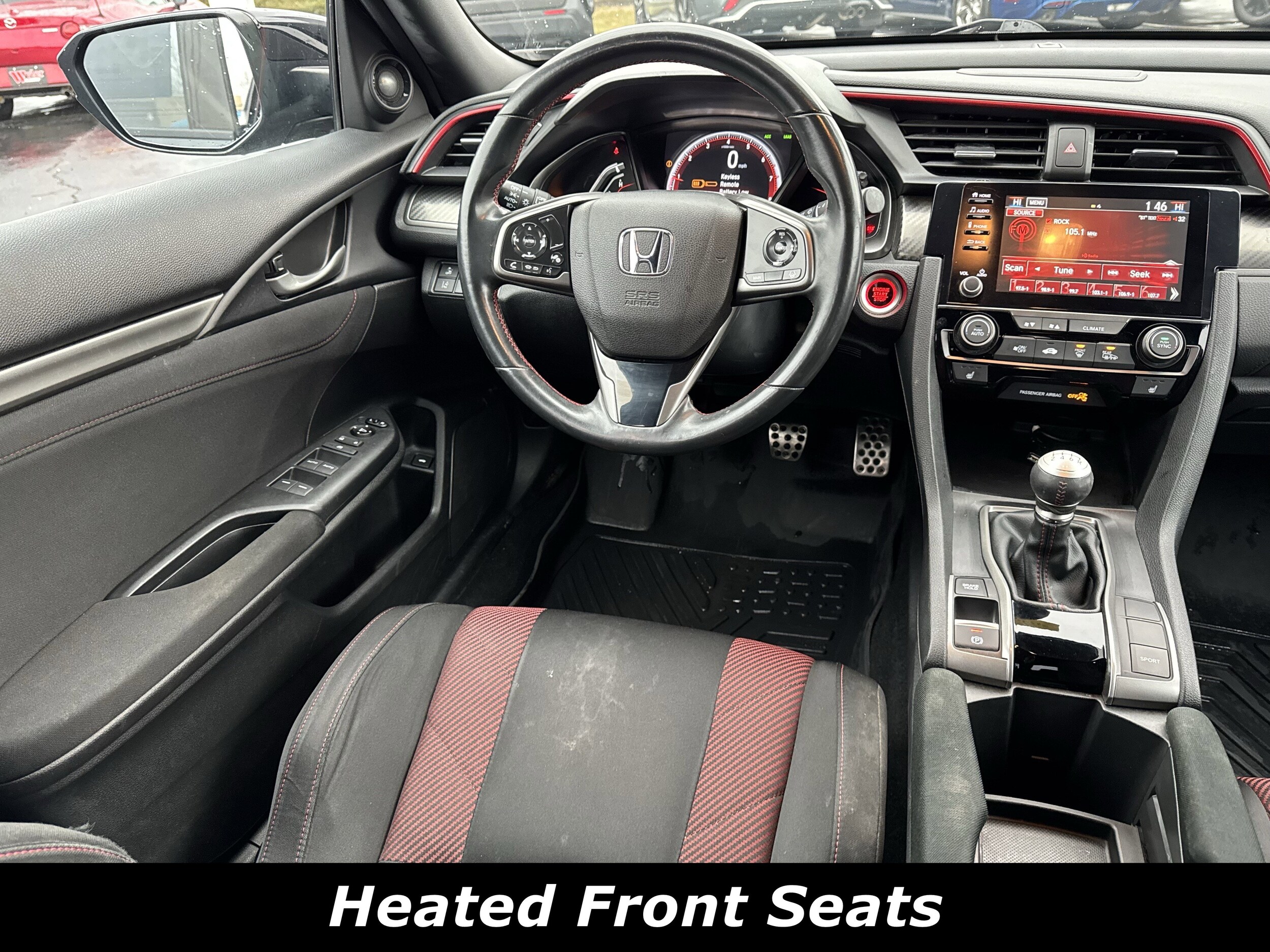 Recent Arrival! Cloth. 26/36 City/Highway MPG Cloth, 10 Speakers, 4-Wheel Disc Brakes, ABS brakes, Air Conditioning, Alloy wheels, AM/FM radio: SiriusXM, Apple CarPlay/Android Auto, Auto High-beam Headlights, Automatic temperature control, Brake assist, Bumpers: body-color, Cloth Seat Trim, Delay-off headlights, Driver door bin, Driver vanity mirror, Dual front impact airbags, Dual front side impact airbags, Electronic Stability Control, Emergency communication system: HondaLink, Exterior Parking Camera Rear, Forward collision: Collision Mitigation Braking System (CMBS) + FCW mitigation, Four wheel independent suspension, Front anti-roll bar, Front Bucket Seats, Front Center Armrest, Front dual zone A/C, Front fog lights, Front reading lights, Fully automatic headlights, Heated door mirrors, Heated Front Bucket Seats, Heated front seats, Illuminated entry, Lane departure: Lane Keeping Assist System (LKAS) active, Leather Shift Knob, Low tire pressure warning, Occupant sensing airbag, Outside temperature display, Overhead airbag, Panic alarm, Passenger door bin, Passenger vanity mirror, Power door mirrors, Power moonroof, Power steering, Power windows, Radio data system, Radio: 450-Watt Premium Audio System w/10 Speakers, Rear anti-roll bar, Rear seat center armrest, Rear window defroster, Remote keyless entry, Security system, Speed control, Speed-sensing steering, Speed-Sensitive Wipers, Split folding rear seat, Spoiler, Steering wheel mounted audio controls, Tachometer, Telescoping steering wheel, Tilt steering wheel, Traction control, Trip computer, Variably intermittent wipers, and Wheels: 18 Matte Black Alloy.