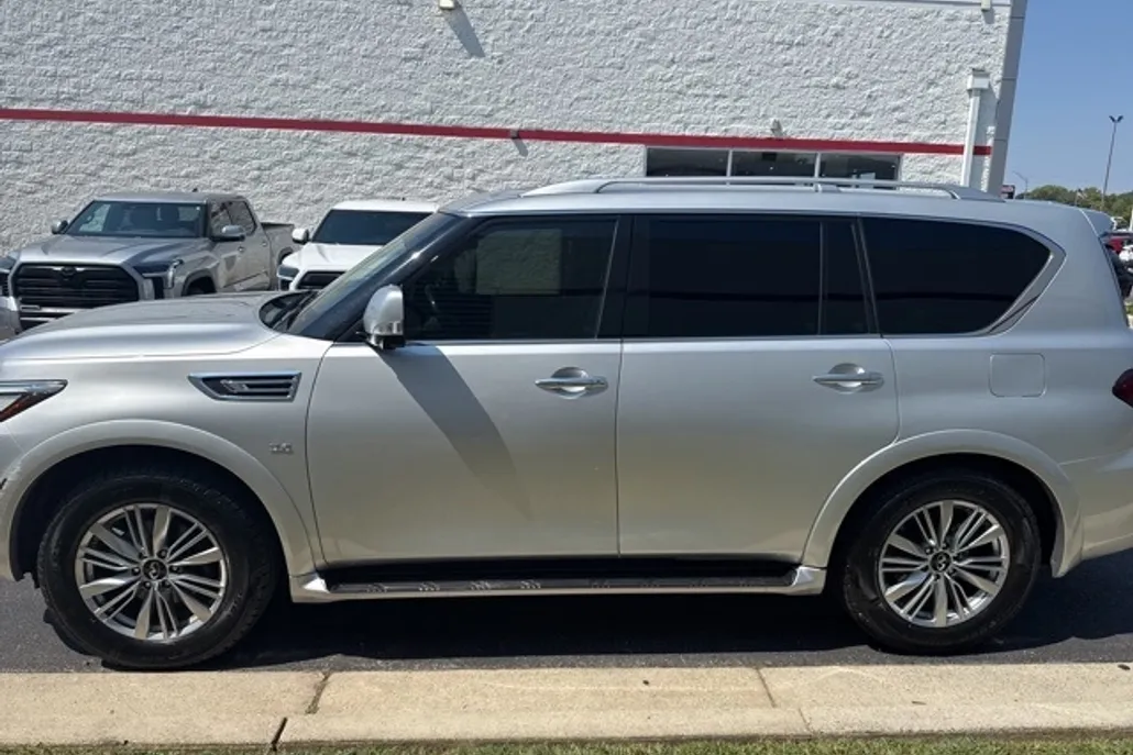 This 2020 INFINITI QX80 LUXE in Liquid Platinum features a 5.6L V8 engine, 7-Speed Automatic transmission, and 4WD. The vehicle is equipped with a range of luxury and safety features, including a navigation system, heated seats, and blind spot warning. Please verify any information in question with the dealership.