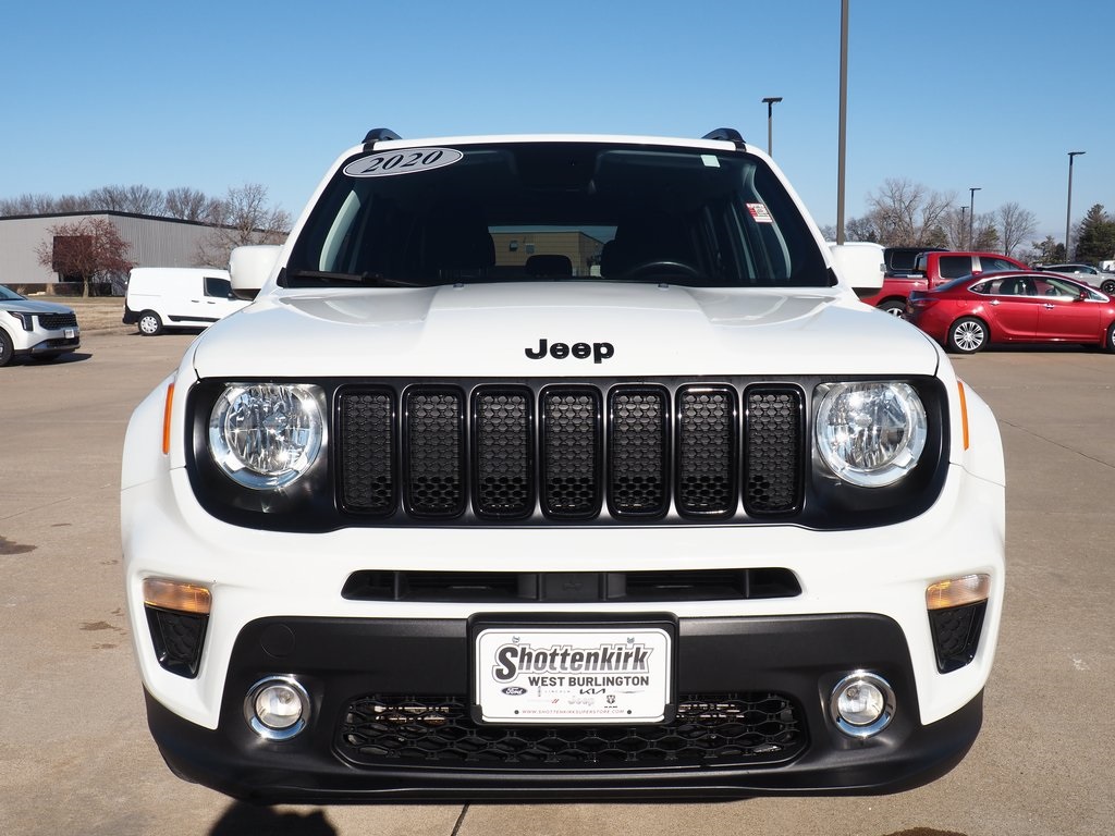 Clean CARFAX. 21/29 City/Highway MPG 2020 Jeep Renegade Altitude Alpine White Clearcoat 4D Sport Utility 2.4L I4 9-Speed 948TE Automatic 4WD Altitude This vehicle comes well equipped with Altitude Package, Cold Weather Group (Heated Front Seats, Leather Wrapped Steering Wheel, Rain Sensitive Windshield Wipers, and Windshield Wiper De-Icer), Passive Entry Remote Start Package, Quick Order Package 2XM Altitude (Deluxe Cloth High-Back Bucket Seats, Exterior Mirrors w/Supplemental Signals, Vinyl Door Trim Panel, and Wheels: 17" x 7" Gloss Black), 17" x 7.0" Aluminum Wheels, 3.734 Final Drive Ratio, 4-Wheel Disc Brakes, 6 Speakers, ABS brakes, Air Conditioning, Alloy wheels, AM/FM radio: SiriusXM, Anti-whiplash front head restraints, Apple CarPlay/Android Auto, Automatic temperature control, Brake assist, Compass, Connectivity (Bridge Solution) (DISC), Delay-off headlights, Driver door bin, Driver vanity mirror, Dual front impact airbags, Dual front side impact airbags, Electronic Stability Control, Emergency communication system, Four wheel independent suspension, Front anti-roll bar, Front Bucket Seats, Front Center Armrest, Front dual zone A/C, Front fog lights, Front reading lights, Fully automatic headlights, Global Telematics Box Module (TBM) (DISC), Heated door mirrors, Illuminated entry, Knee airbag, Low tire pressure warning, Manual Adjust 4-Way Front Passenger Seat, Manufacturer's Statement of Origin, Normal Duty Suspension, Occupant sensing airbag, Outside temperature display, Overhead airbag, Panic alarm, ParkView Rear Back-Up Camera, Passenger door bin, Passenger vanity mirror, Power door mirrors, Power steering, Power windows, Premium Cloth Bucket Seats, Radio data system, Radio: Uconnect 4 w/7" Display, Rear anti-roll bar, Rear window defroster, Rear window wiper, Remote keyless entry, Roof rack: rails only, Speed control, Split folding rear seat, Spoiler, Steering wheel mounted audio controls, Tachometer, Telescoping steering wheel, Tilt steering wheel, Traction control, Trip computer, Variably intermittent wipers, and Voltmeter.