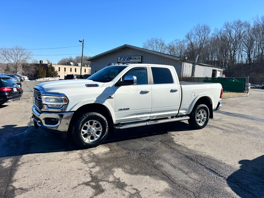 This 2020 Ram 2500 Laramie 4x4 Crew Cab 6'4" Box is available for sale in Berlin, Connecticut. It features a Bright White Clearcoat exterior with a Black Leather interior and is equipped with a 6.7 L Straight 6 Cylinder Engine and automatic transmission. The vehicle offers a comfortable and powerful driving experience, making it ideal for those seeking a heavy-duty truck with luxury features.