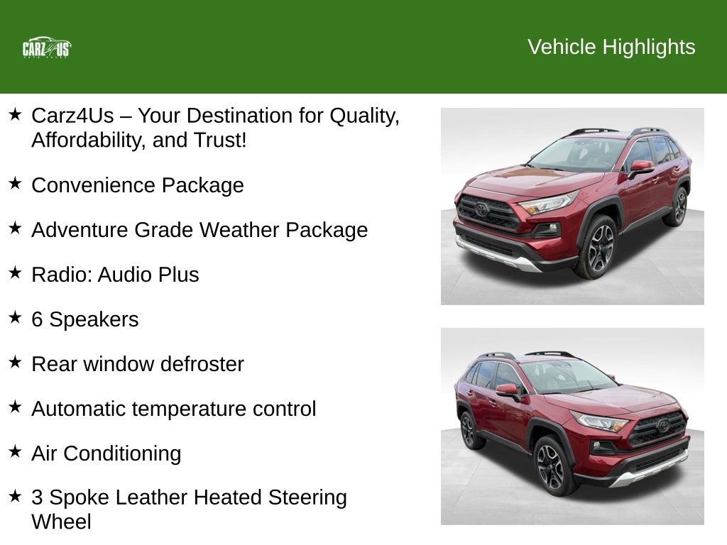 CARZ4US–Your Auto-Buying Experience is Always Better with Us! At CARZ4US, we are dedicated to providing top-quality vehicles, unmatched customer service, and a stress-free buying experience. With the highest Google review ratings, flexible financing options, and a guarantee that everyone gets approved, we make Car-buying simple, reliable, and rewarding. CARZ4US partners with trusted lenders like Capital One to secure the best financing rates and works with providers like Allstate to offer premium protection plans tailored to your needs. You can drive with confidence knowing you’re getting the best deal and coverage. With convenient locations in South Hackensack, NJ, and Pine Brook, NJ, we are ready to serve you wherever you are. Stop by either location to explore our 300+ vehicles in stock, offering options to Fit every budget, and experience exceptional service firsthand. Ready to get started? Contact us today at 855-227-9487, book your appointment, and follow us on Instagram at @carz4us.auto for the latest updates and deals! Elevate Your Driving Experience with the 2020 Toyota RAV4 Adventure Introducing the 2020 Toyota RAV4 Adventure, a versatile and capable SUV that’s ready to take you on any journey. This exceptional vehicle boasts a stunning red exterior, complemented by a host of premium features that will elevate your driving experience. Under the hood, the RAV4 Adventure is powered by a 2.5L 4-Cylinder DOHC Dual VVT-i engine, paired with an 8-Speed Automatic transmission and All-Wheel Drive. This dynamic powertrain delivers an impressive 25 MPG in the city and 33 MPG on the highway, ensuring exceptional fuel efficiency and a smooth, responsive ride. Stepping inside, you’ll be greeted by a spacious and well-appointed cabin, featuring 6 speakers, an Audio Plus radio, and a range of advanced technology features. The Entune Safety Connect system provides added peace of mind, while the Front Bucket Seats and 3-Spoke Leather Heated Steering Wheel offer unparalleled comfort and control. The RAV4 Adventure also boasts a comprehensive suite of safety features, including Electronic Stability Control, Dual Front Impact Airbags, Dual Front Side Impact Airbags, and a Rear View Camera. With its rugged design and advanced capabilities, this SUV is ready to tackle any terrain with confidence. Don’t just buy a Car—experience the Carz4us difference! With our unbeatable selection, expert financing options, and commitment to your satisfaction, there’s no better place to find your next vehicle. Visit us today and let our team help you drive home in the Car you’ve been dreaming of! Contact us today at 855-227-9487 and follow us on Instagram at @carz4us.auto to stay updated on the latest deals and inventory. Visit us and experience the difference!