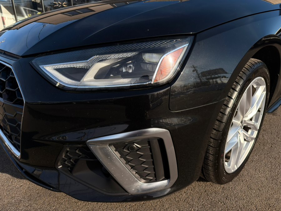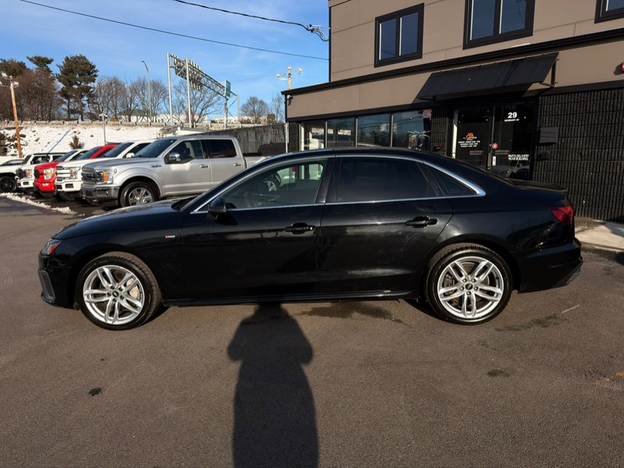 2021 Audi A4 Sedan S line Premium 45 TFSI quattro, available for sale in Peabody, Massachusetts. This vehicle features a 2.0L TFSI 4-cylinder engine with keyless start/stop, full-time all-wheel drive, and a luxurious black interior. The car is equipped with advanced technology and safety features, offering a comfortable and dynamic driving experience.