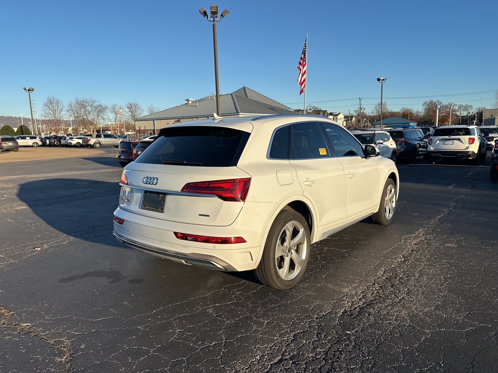 2021 Audi Q5 45 Premium Plus quattro, 4D Sport Utility, 2.0L Turbocharged, 7-Speed Automatic S tronic, quattro, Ibis White, Atlas Beige Leather, 10 Speakers, 4-Wheel Disc Brakes, 5.302 Axle Ratio, ABS brakes, Air Conditioning, Alloy wheels, AM/FM radio, Auto High-beam Headlights, Auto-dimming Rear-View mirror, Automatic temperature control, Brake assist, Bumpers: body-color, Compass, Cruise Control, Delay-off headlights, Driver door bin, Driver vanity mirror, Dual front impact airbags, Dual front side impact airbags, Electronic Stability Control, Emergency communication system: Audi connect CARE, Four wheel independent suspension, Front anti-roll bar, Front Bucket Seats, Front Center Armrest, Front dual zone A/C, Front fog lights, Front reading lights, Garage door transmitter: HomeLink, Genuine wood console insert, Genuine wood dashboard insert, Genuine wood door panel insert, Heated 8-Way Power Front Bucket Seats, Heated and Cooled Seats, Heated door mirrors, Illuminated entry, Leather Seating Surfaces, Leather Shift Knob, Low tire pressure warning, Occupant sensing airbag, Outside temperature display, Overhead airbag, Overhead console, Panic alarm, Passenger door bin, Passenger vanity mirror, Power door mirrors, Power driver seat, Power Liftgate, Power passenger seat, Power steering, Power windows, Radio data system, Radio: Audi Sound System, Rain sensing wipers, Rear air conditioning, Rear anti-roll bar, Rear fog lights, Rear seat center armrest, Rear window defroster, Rear window wiper, Rearview Camera, Remote keyless entry, Roof rack, Security system, Speed-sensing steering, Speed-Sensitive Wipers, Split folding rear seat, Spoiler, Steering wheel mounted audio controls, Tachometer, Telescoping steering wheel, Tilt steering wheel, Traction control, Trip computer, Turn signal indicator mirrors, Variably intermittent wipers, Wheels: 18" 5-Arm-Star Design. Ibis White 7-Speed Automatic S tronic Clean CARFAX. CARFAX One-Owner.
