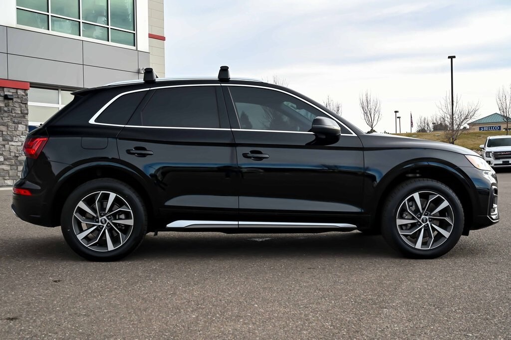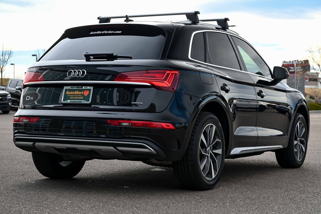 2021 Audi Q5 45 Premium Plus quattro Black quattro 2.0L Turbocharged 7-Speed Automatic S tronic. Black Leather, Black Leather, 10 Speakers, 4-Wheel Disc Brakes, 5.302 Axle Ratio, ABS brakes, Air Conditioning, AM/FM radio, Auto High-beam Headlights, Auto-dimming Rear-View mirror, Automatic temperature control, Brake assist, Bumpers: body-color, Compass, Delay-off headlights, Driver door bin, Driver vanity mirror, Dual front impact airbags, Dual front side impact airbags, Electronic Stability Control, Emergency communication system: Audi connect CARE, Exterior Parking Camera Rear, Four wheel independent suspension, Front anti-roll bar, Front Bucket Seats, Front Center Armrest, Front dual zone A/C, Front fog lights, Front reading lights, Garage door transmitter: HomeLink, Genuine wood console insert, Genuine wood dashboard insert, Genuine wood door panel insert, Heated 8-Way Power Front Bucket Seats, Heated door mirrors, Heated front seats, Illuminated entry, Leather Seating Surfaces, Leather Shift Knob, Low tire pressure warning, Occupant sensing airbag, Outside temperature display, Overhead airbag, Overhead console, Panic alarm, Passenger door bin, Passenger vanity mirror, Power door mirrors, Power driver seat, Power Liftgate, Power passenger seat, Power steering, Power windows, Premium wheels, Radio data system, Radio: Audi Sound System, Rain sensing wipers, Rear air conditioning, Rear anti-roll bar, Rear fog lights, Rear reading lights, Rear seat center armrest, Rear window defroster, Rear window wiper, Remote keyless entry, Roof rack, Security system, Speed control, Speed-sensing steering, Speed-Sensitive Wipers, Split folding rear seat, Spoiler, Steering wheel mounted audio controls, Tachometer, Telescoping steering wheel, Tilt steering wheel, Traction control, Trip computer, Turn signal indicator mirrors, Variably intermittent wipers, Wheels: 18" 5-Arm-Star Design.